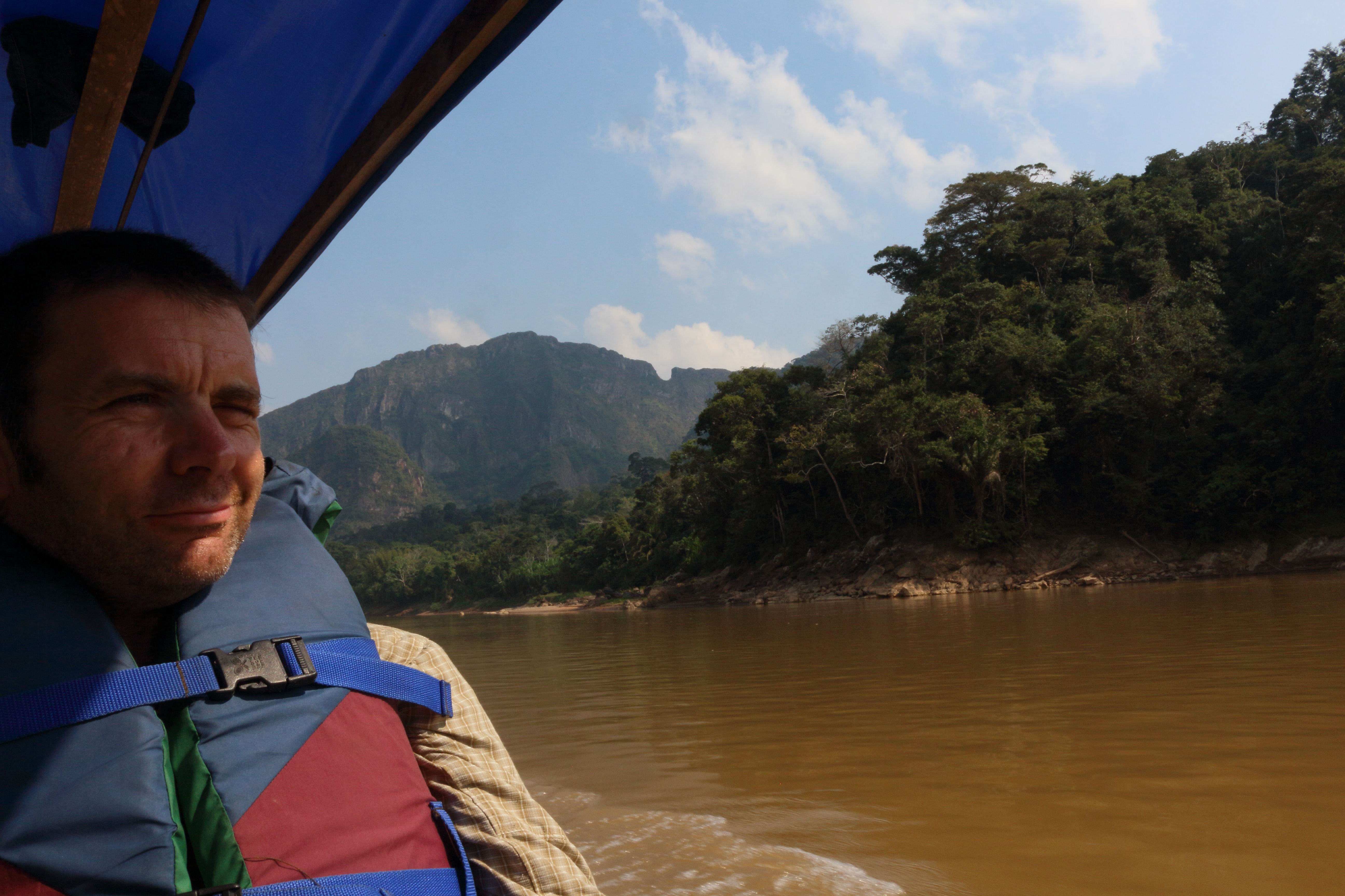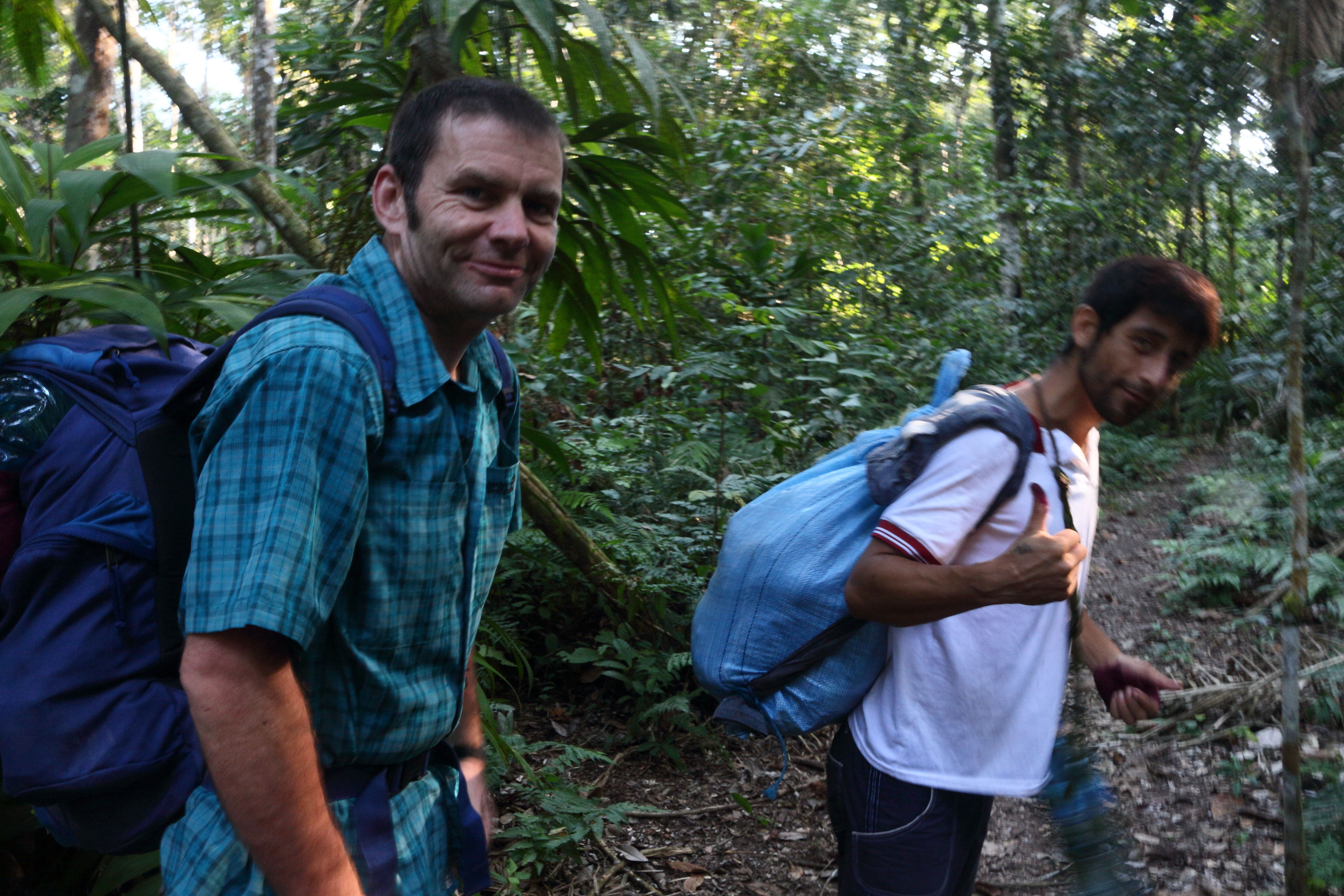 The river’s a bit low at this time of the year and the boat got a bit stuck on pebble-banks – nothing that a bit of brute force from the boat crew couldn’t deal with. After one night at the base-camp, the six of us stuffed our rucksacks with sleeping bags and mosquito nets and headed deeper into the jungle on foot. We tourists carried our own gear and water, but Darwin had the mammoth task of carrying not only his own gear, but also the food supplies for the six of us! Not only this, but he did so with a make-shift rucksack that he had fashioned himself from a hessian sack and an old pairs of jeans for the straps! A bad-back-in-waiting, me thinks!