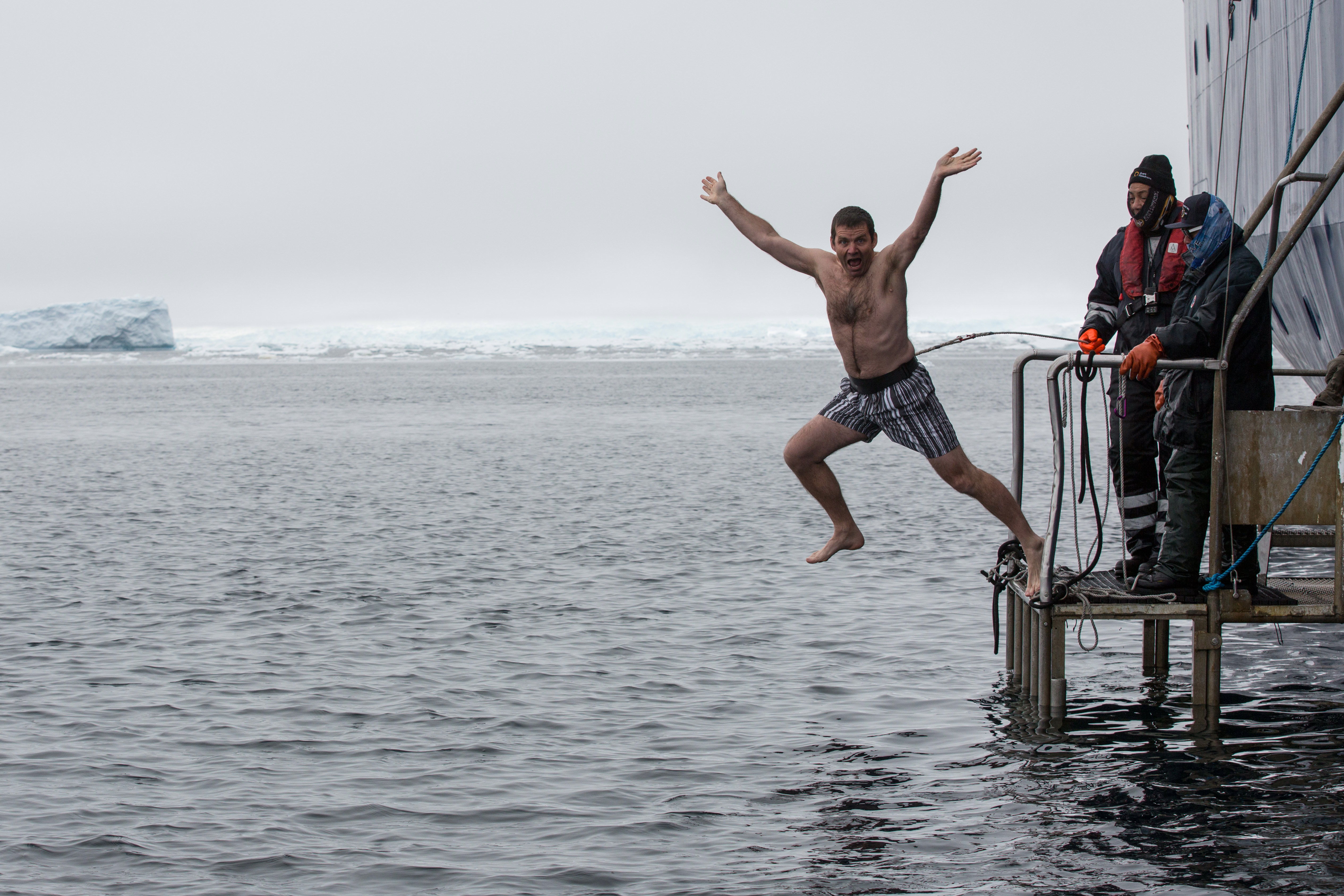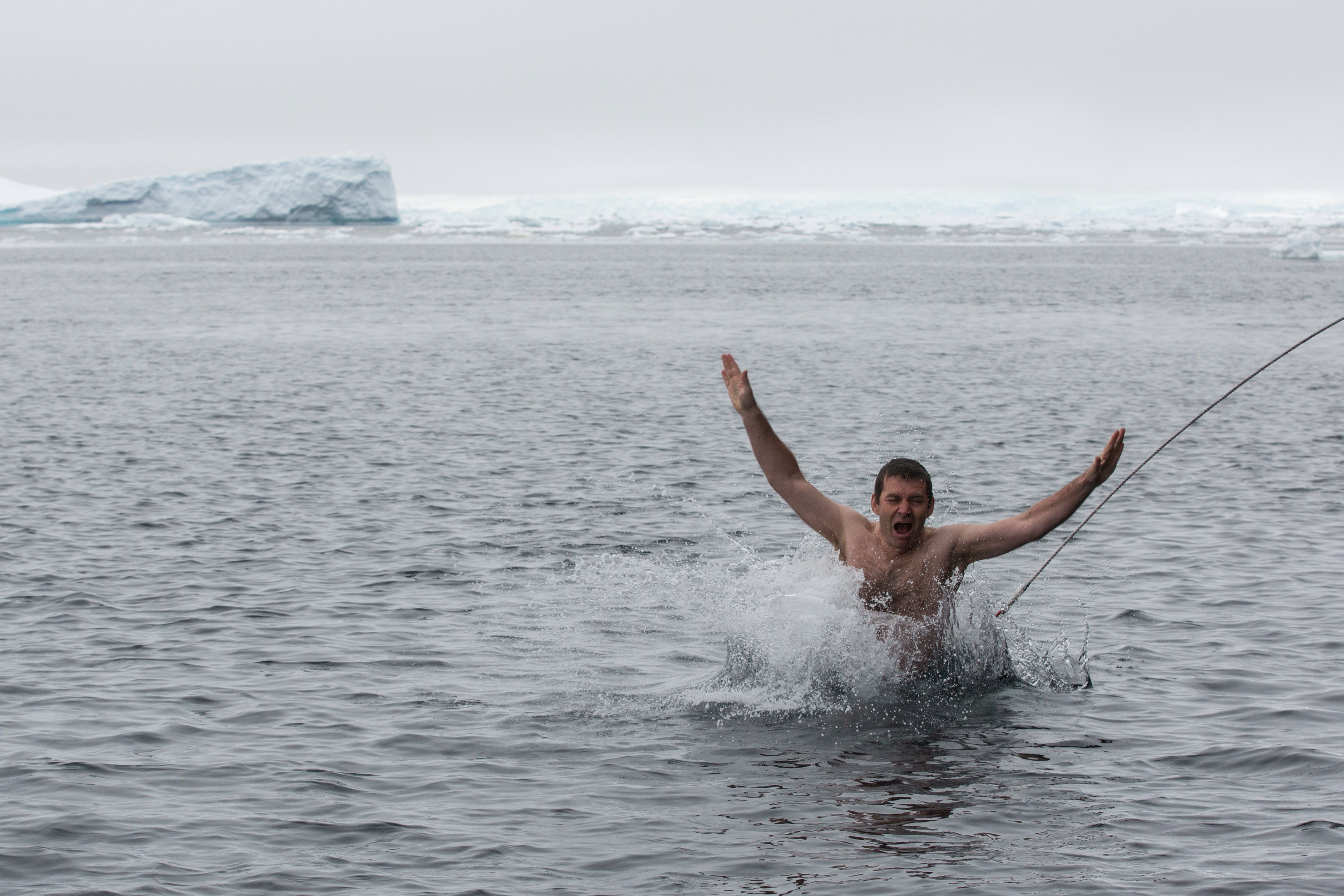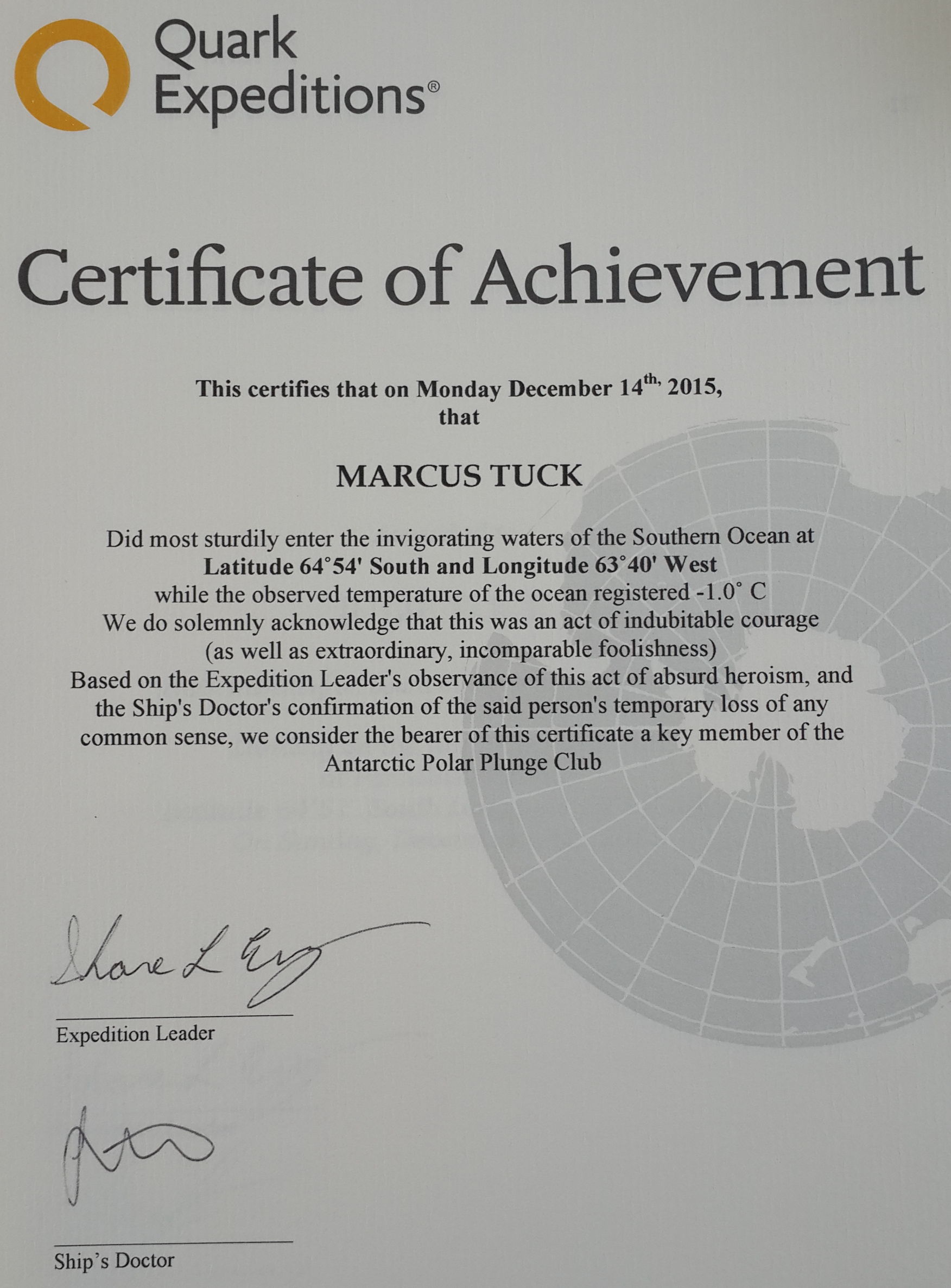 One of the ‘unique’ opportunities that arises for travelers to Antarctica is the chance to do the ‘Polar Plunge’ – taking a dip in the polar waters, temperature: -1°C (yes, that is a minus, not a grammatical dash for dramatic effect!). Quite why any sane person would avail themselves of such an opportunity is beyond my comprehension, but Marcus couldn’t let the golden moment pass. From the (relative) warmth of the upper viewing deck with a hot cup of tea in hand, I looked down to watch him take his turn to leap into the Antarctic Ocean amongst the icebergs. He was amongst a bewildering 53 other passengers who did this, including a very game 70 year old chap (British of course!). The certificate from the ship tells the tale, but I think the look on Marcus’ face when he surfaced tells it better 🙂