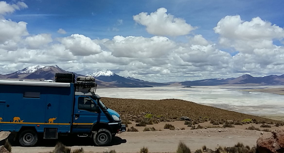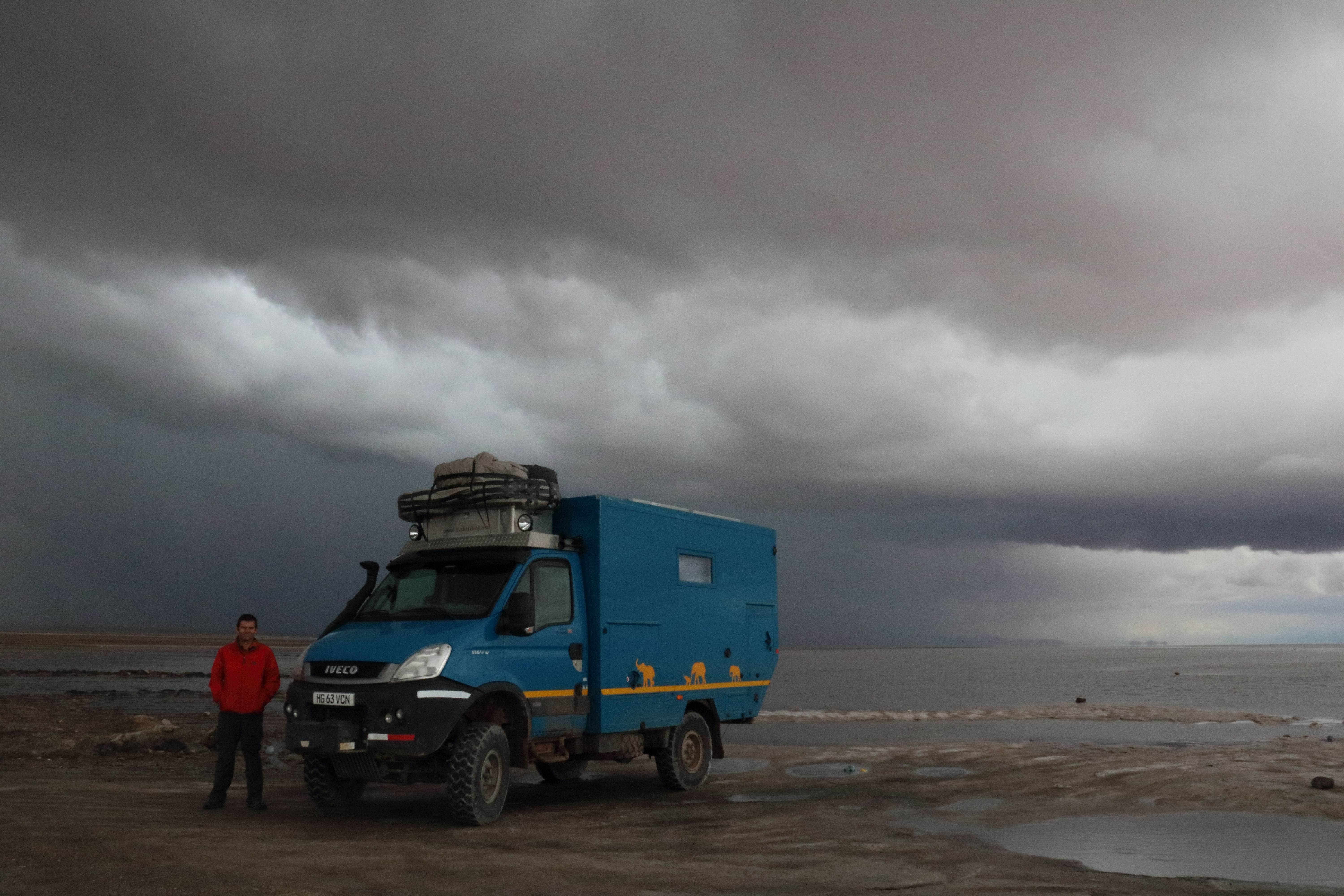 Long-term followers of the Cuthbert blog may recall that we have been to Uyuni before, on our trip to Bolivia in July last year. In the then winter dry season, we took Cuthbert out onto the spectacular, world’s largest salt pans ‘Salar de Uyuni’ (Altiplano and Whiteness) which was certainly one of the highlights of our whole South America trip so far: an extraordinary experience blasting around randomly on the seemingly endless white salt crust. Thing is… it’s no longer the dry season. The vast dry salt crust is now a vast wet salt lake! The water is mostly only a few inches deep, but it is of course, very salty water. Several locals and tour companies are venturing out into the water in their 4x4s, but we decide that a saline belly-scrub is not conducive to Cuthbert’s long-term preservation and we park-up by the shore.