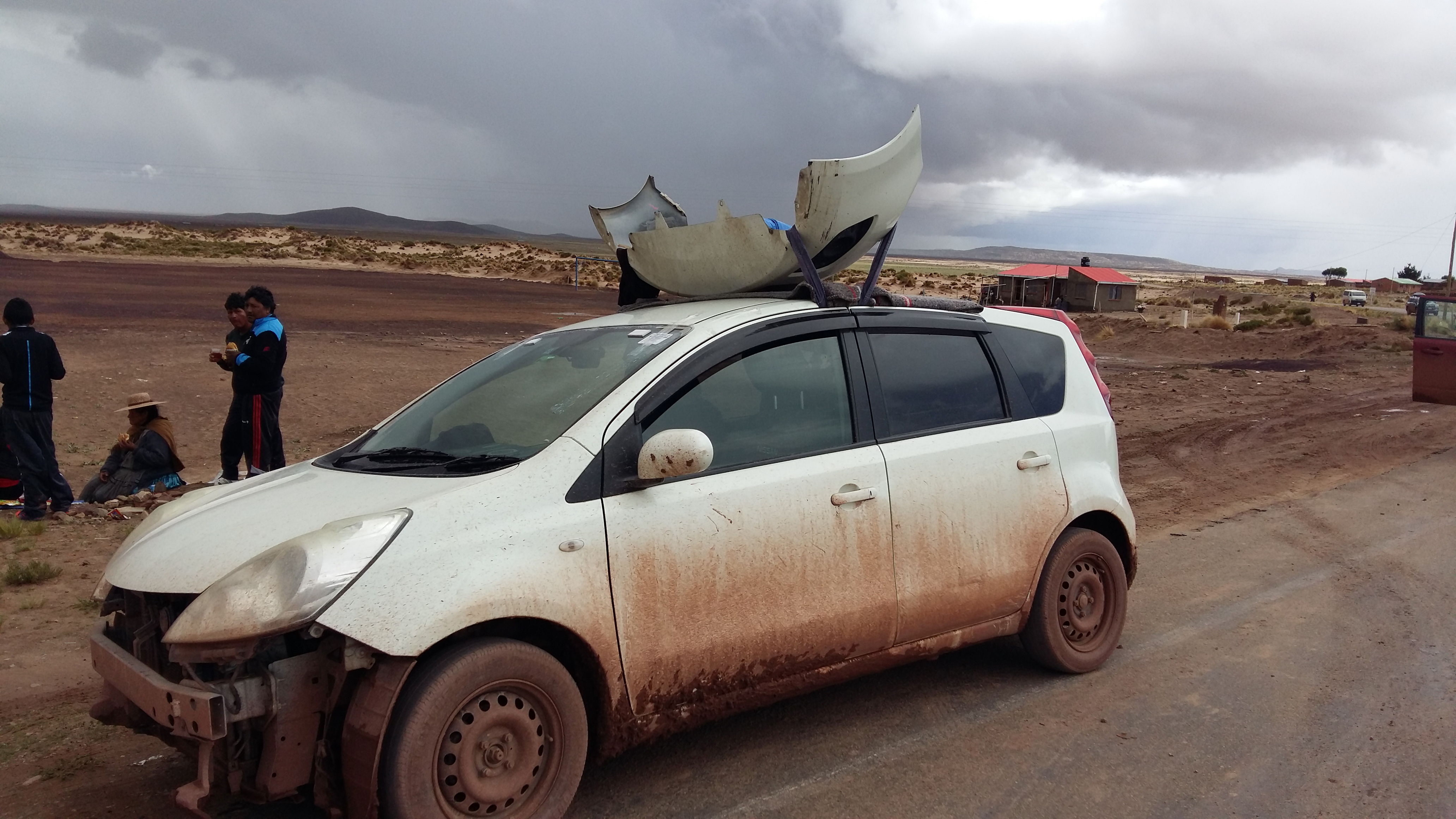Finally before leaving Tarija we have the mission of getting Cuthbert’s air-filter bracket welded. It hasn’t broken yet, but Marcus notices in his routine checks that the previous weld (from Iquique around 5 months ago) is starting to crack again. The rough roads from chasing the Dakar Rally and the last few days bouncing across southern Bolivia have taken their toll on this particular weak-spot. Luckily it’s not critical; it’s easy and cheap to fix with a friendly local welder.