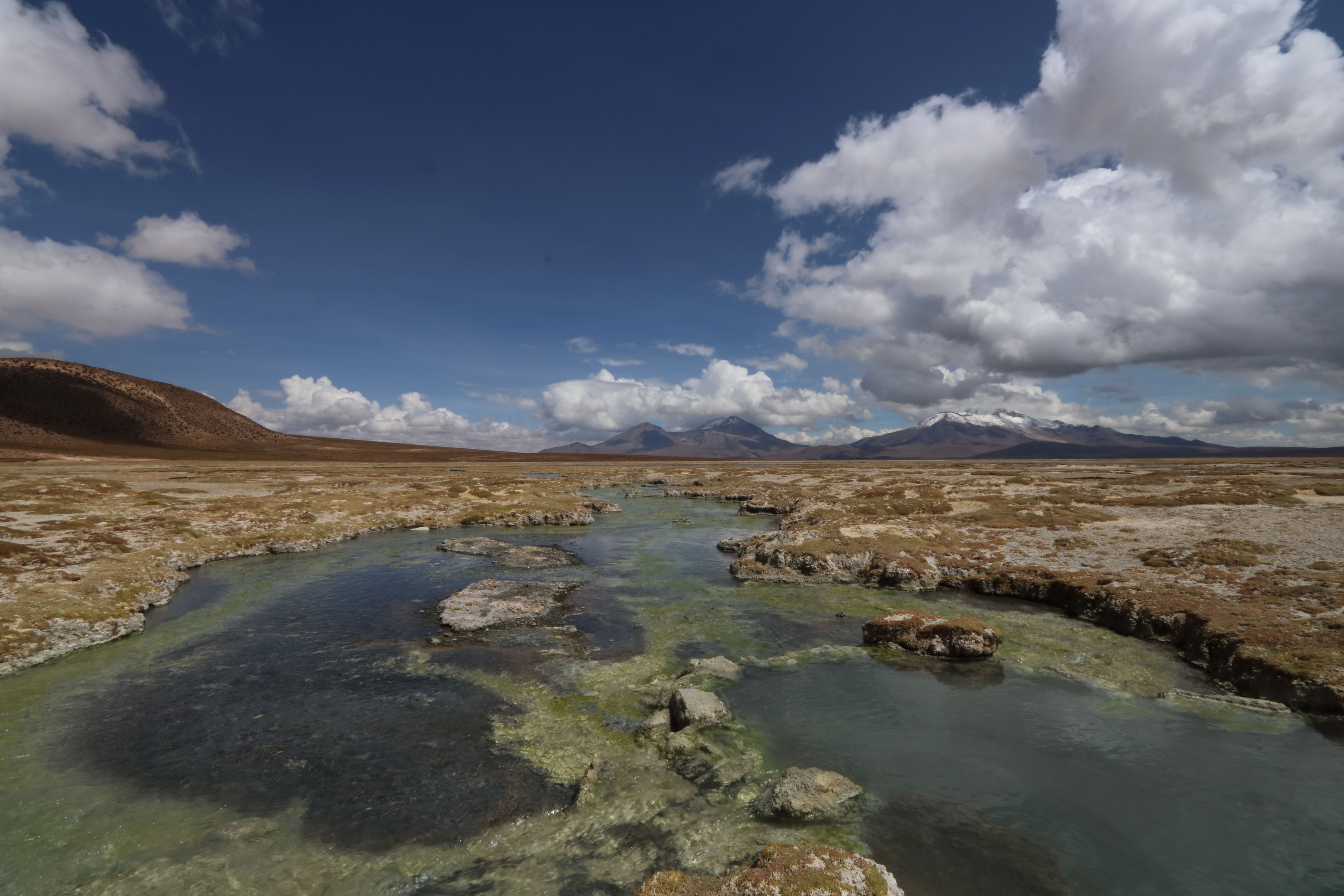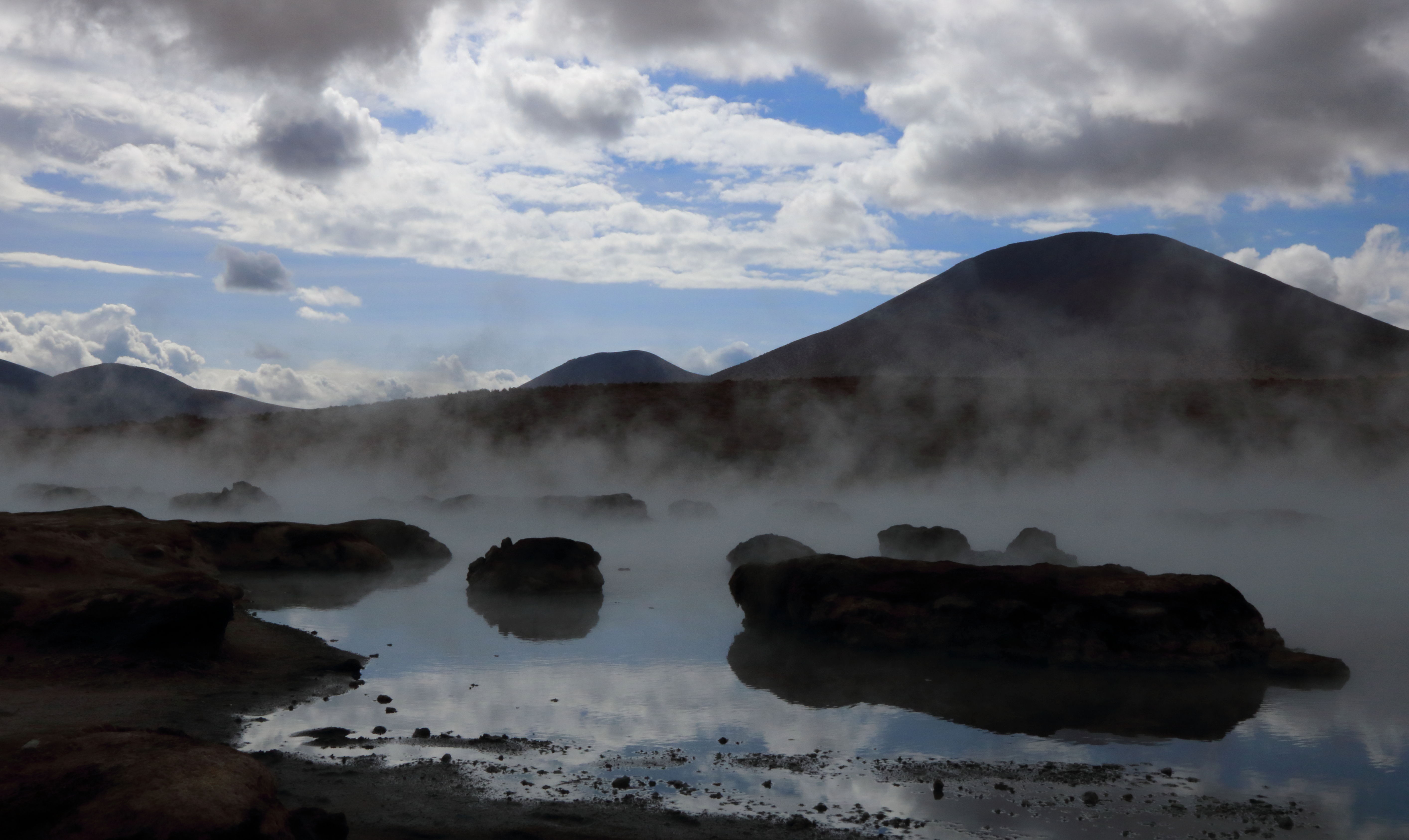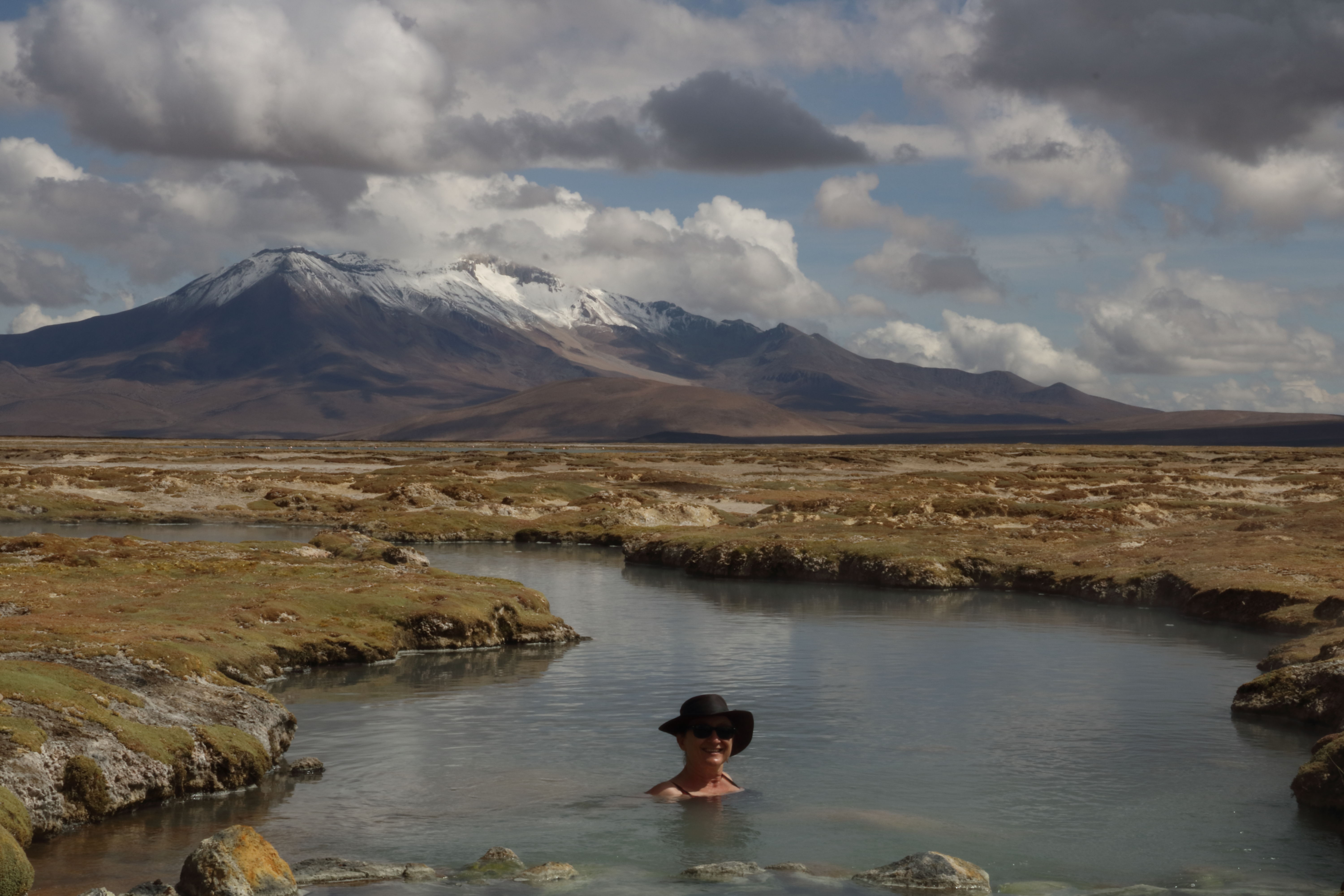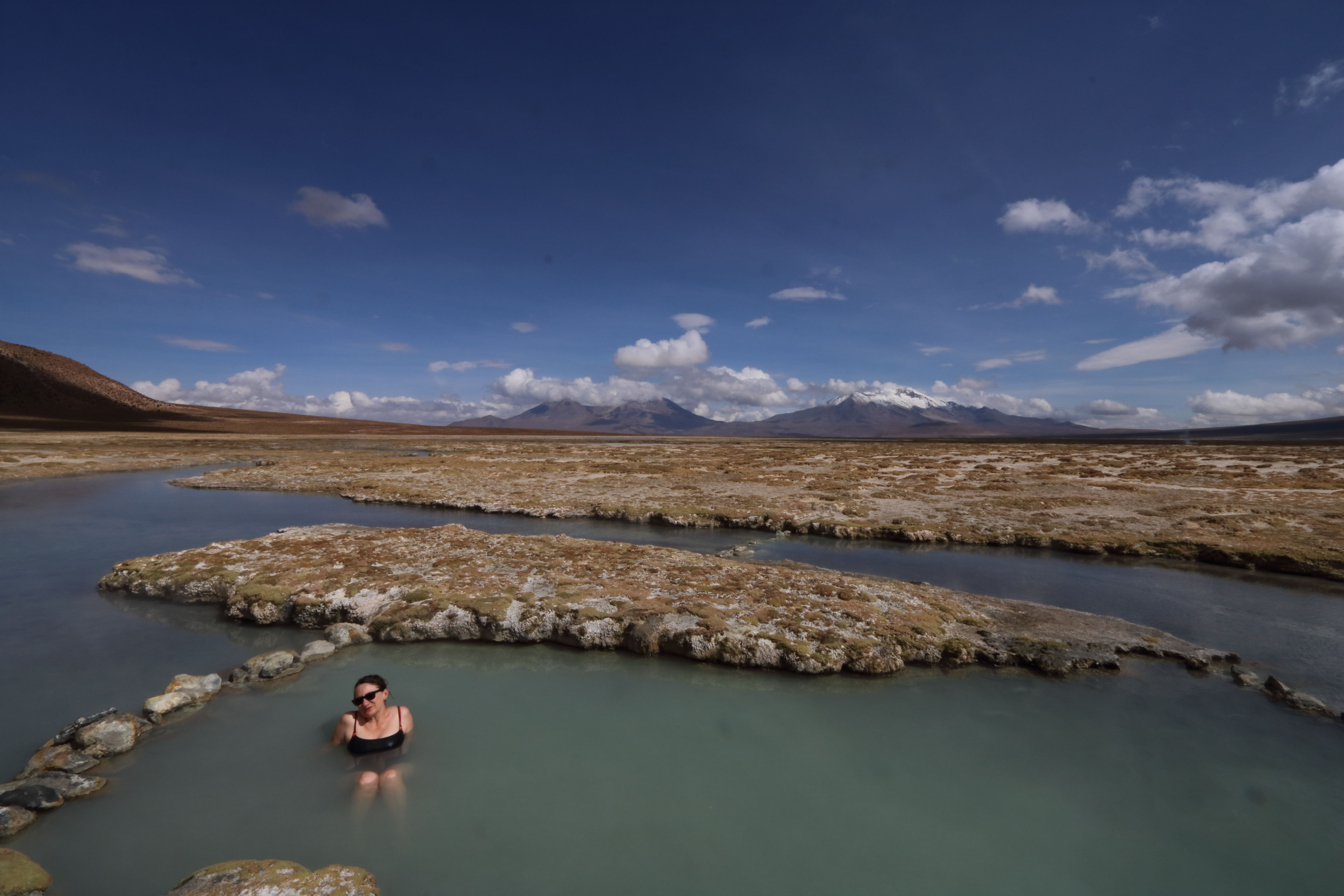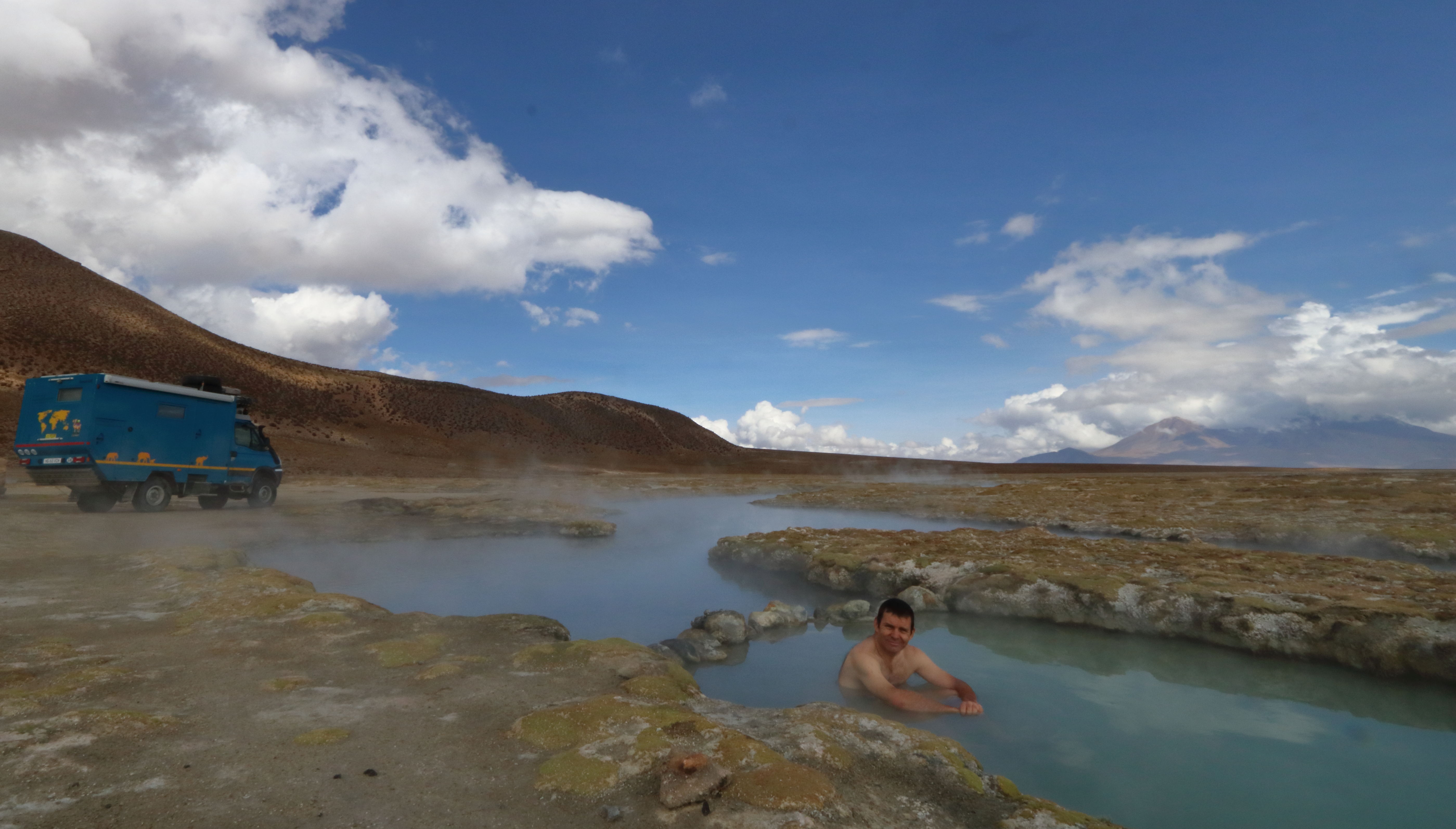 To reach the Pisiga border crossing we take an indirect but very scenic route through the Andes climbing to over 4,500 m (14,700 ft). It’s rough and steep but we find stunning volcanos, bathing in natural steaming-hot springs and great wildlife including flamingos, vicuñas, llamas, vizcachas! Pictures tell the story better than words: