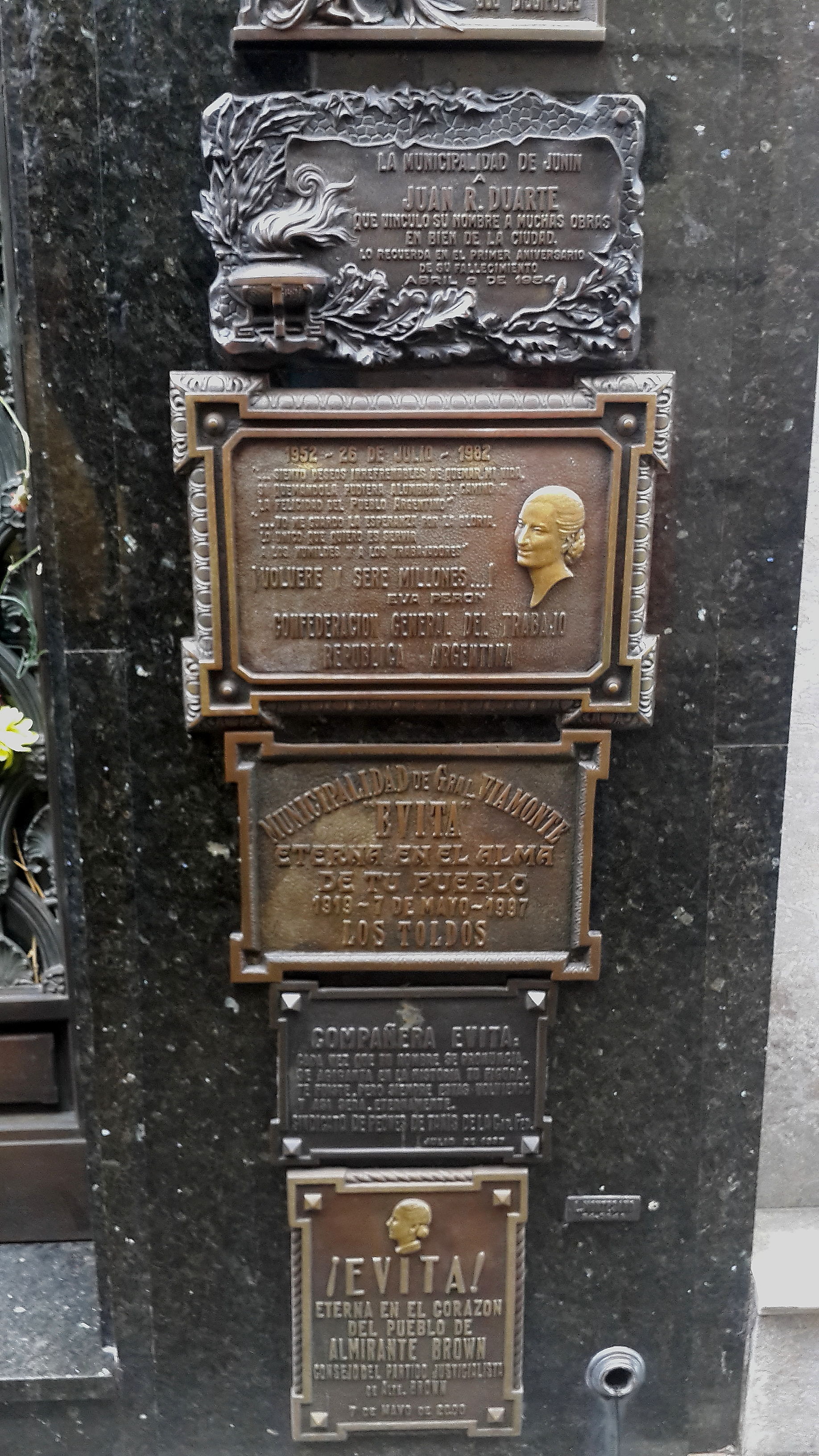 There’s lots to see around BA (we’ve been here a few days now, I think we can move on to more familiar terms 🙂 ) a whole host of art museums and lots of beautiful old architecture. But we focussed next on the Eva connection – the Casa Rosada balcony from which she (and subsequently, Madonna in the movie) made the rousing speeches; her resting-place in the Cemetario Ricoletta; and the museum dedicated to her story.