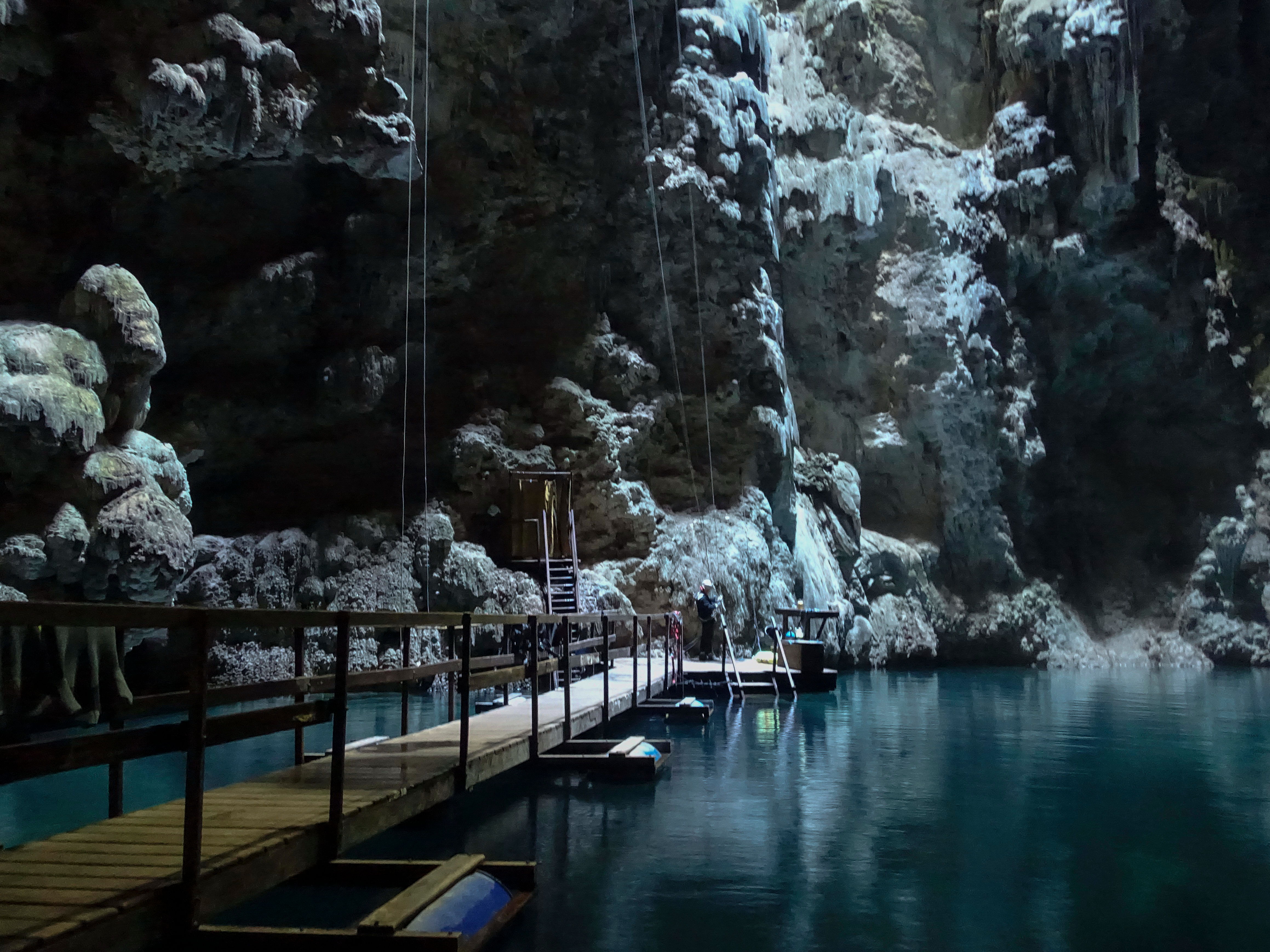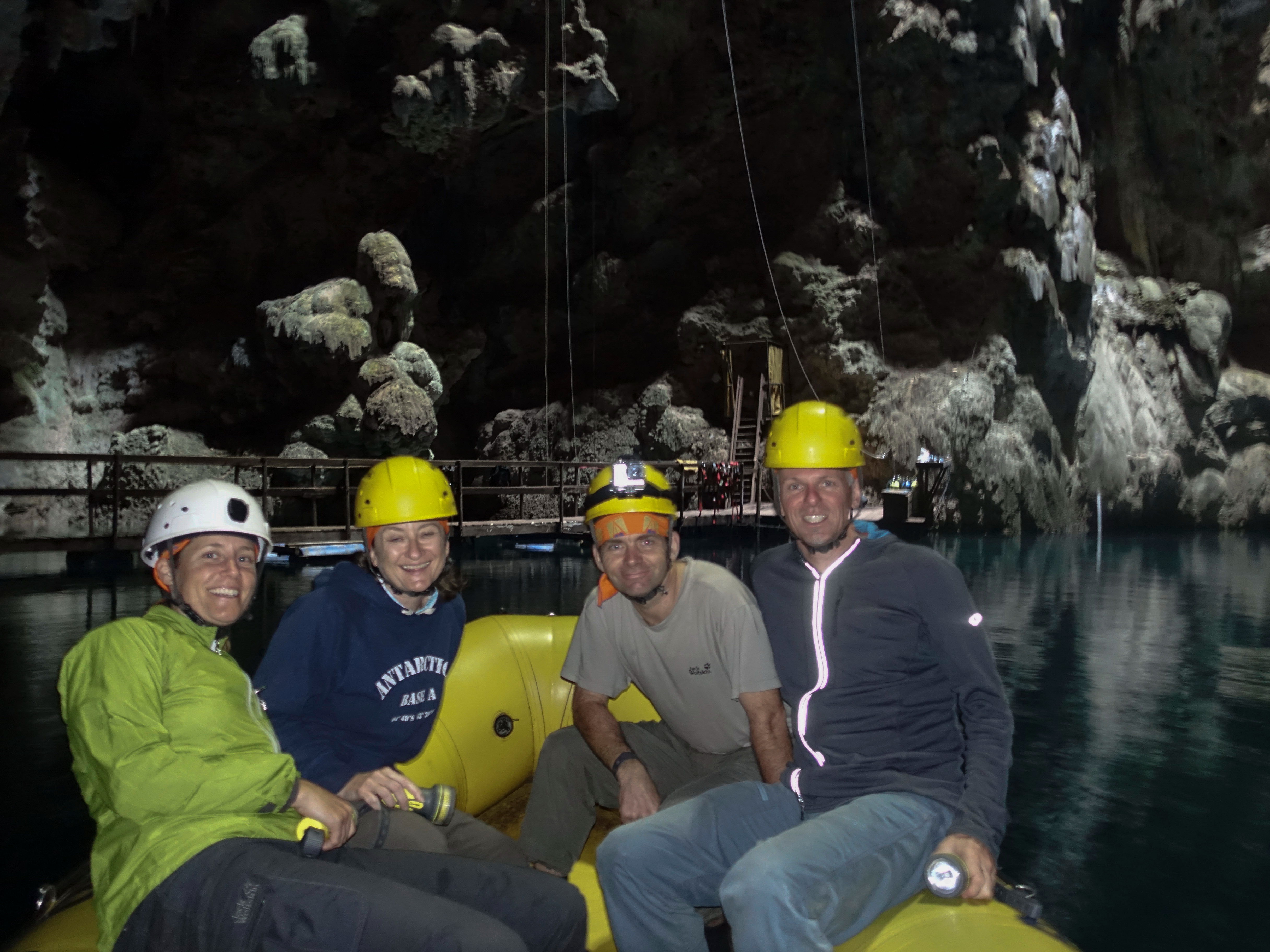 As advertised, an instructor was there to meet us as we reached the pontoon floating on the cave lake at the bottom. Phew! ‘Easy peasy lemon squeezy’ this abseiling lark! 🙂 Then we looked up at the 72 meters of rope leading up to the tiny hole above us. Hmmm… getting back up may be a little trickier, but we’ll worry about that when we come to it 🙂