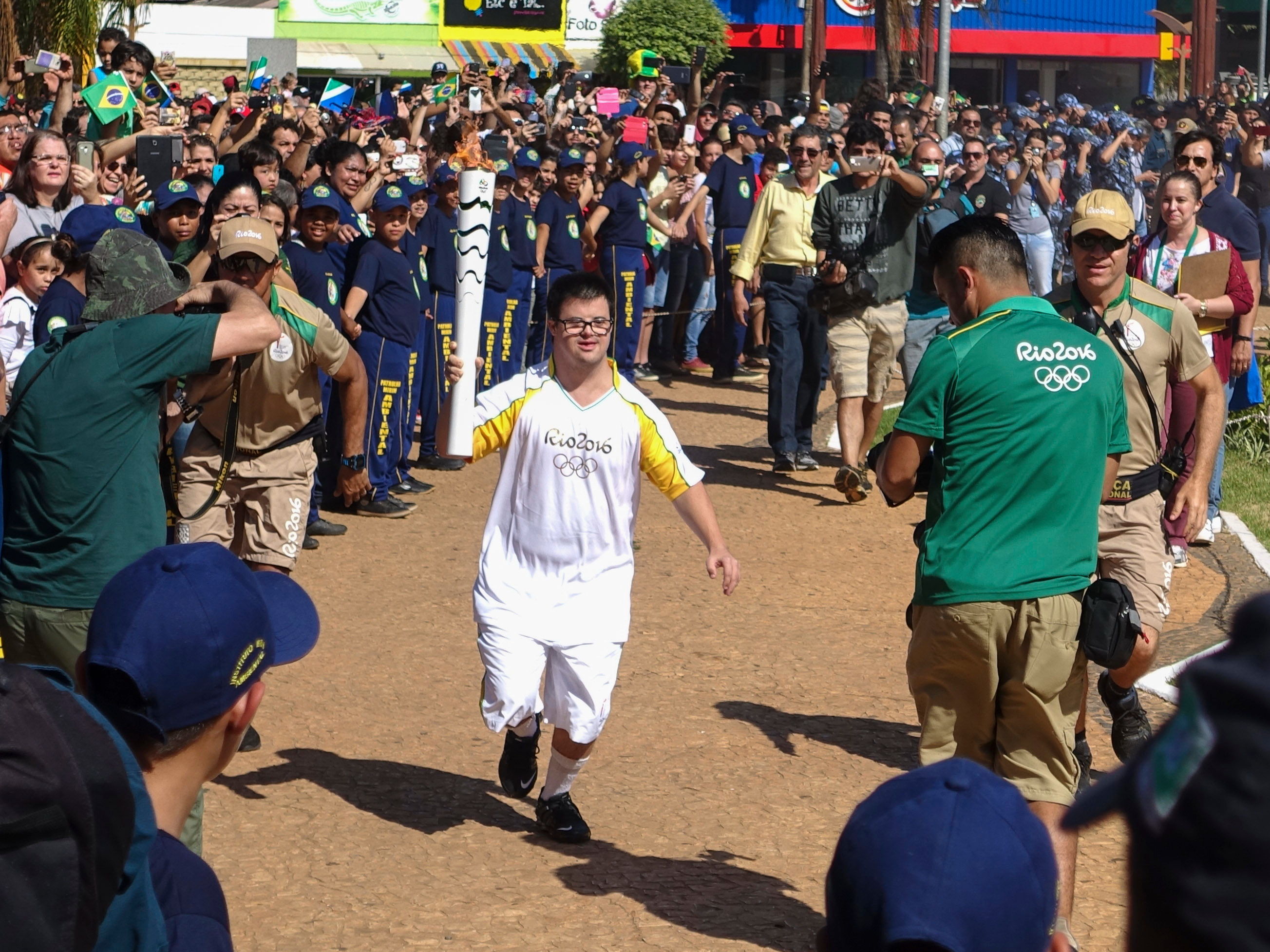 In the town square the crowds gathered to wait… and wait. The anticipation was rising and around an hour later than advertised, a helicopter arrived overhead, yes… that’s directly overhead the crowd. No clear safety area below. What could possibly go wrong??? Well, the Olympic Torch Runs are not having a great safety record so far in Brazil; in Manaus a few days ago a paraded jaguar escaped into the crowd and had to be shot by police! Anyway, here in Bonito the hovering helicopter dropped a rope on which the torch deliverer was meant to abseil down. Unfortunately, the rope didn’t deploy properly and the helicopter had to fly away to sort it out. Twenty minutes later the helicopter returned, the rope was successfully dropped and a soldier abseiled down to hand the Olympic Torch to a young lad who had been waiting in his shiny white Olympic outfit for a couple of hours. The crowd went mad! Anyone would think Tom Cruise had come to town! Sadly this is not the case. If it were, then I would have been there chasing with them 🙂