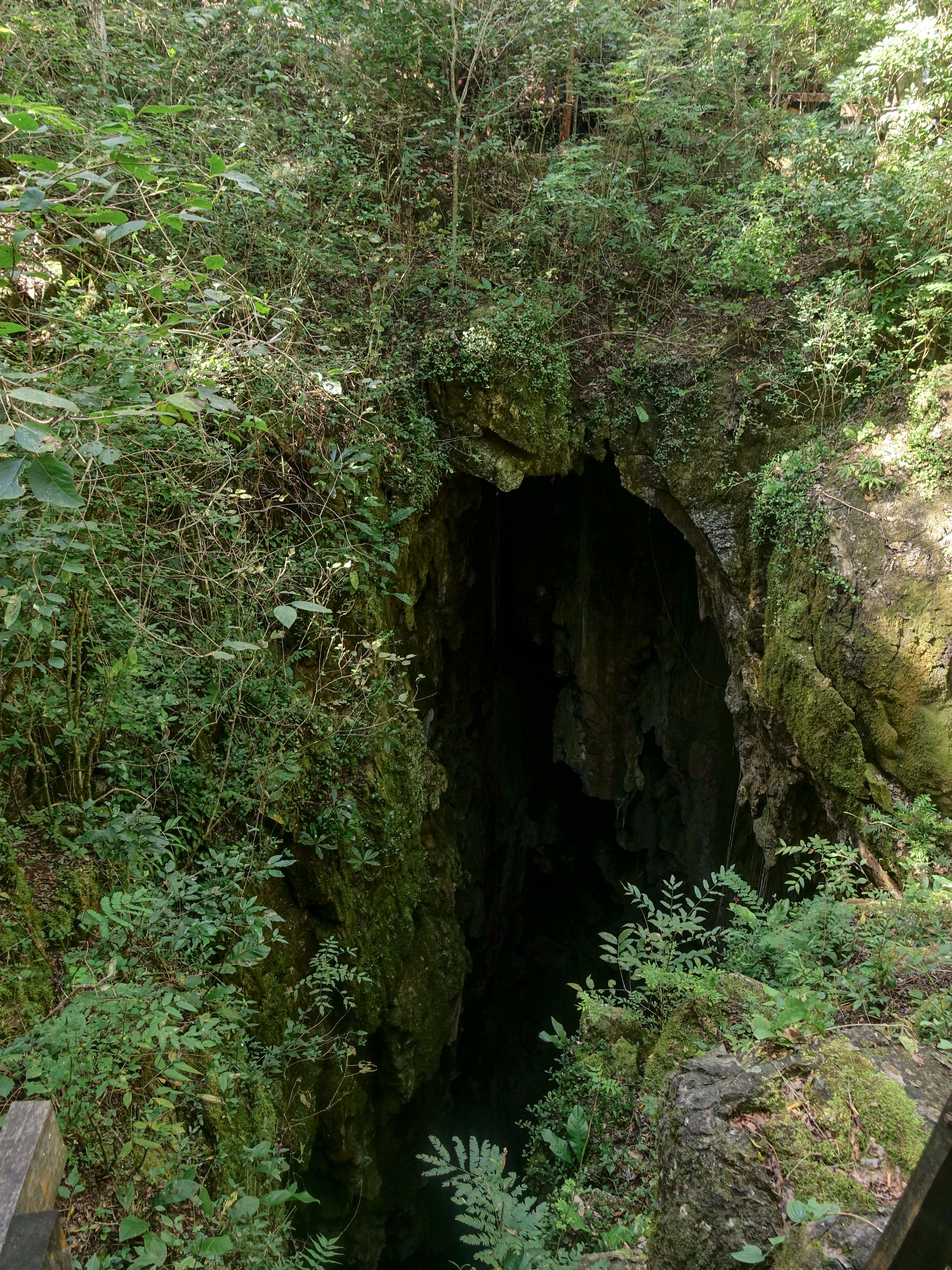 Phase 1 is a training session in town, then  next day Phase 2: the Abyss! At the surface, the Abismo is a small hole only a few metres wide, opening vertically downwards. We stood and looked down into the looming darkness: a tunnel of black with two ropes dangling down into the depths. We’re told that the hole leads to a vast and beautiful underground cavern. Hmmm… I guess we’ll just have to trust them on that! Our training had been on a 10 metre high rig in a well-lit building; the ‘real thing’ looked rather different! So all we have to do is harness-up, hook on, and abseil down, two by two! Right then. Here goes. Marcus and I drop first.