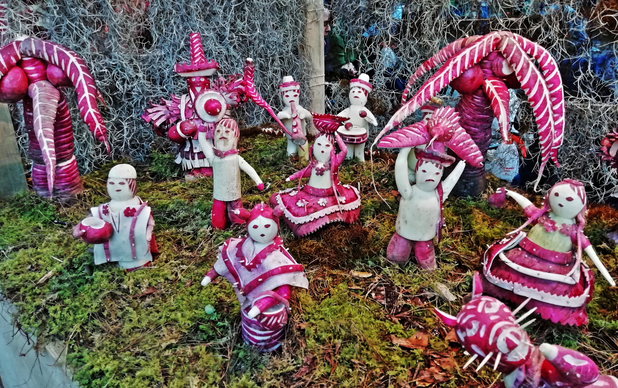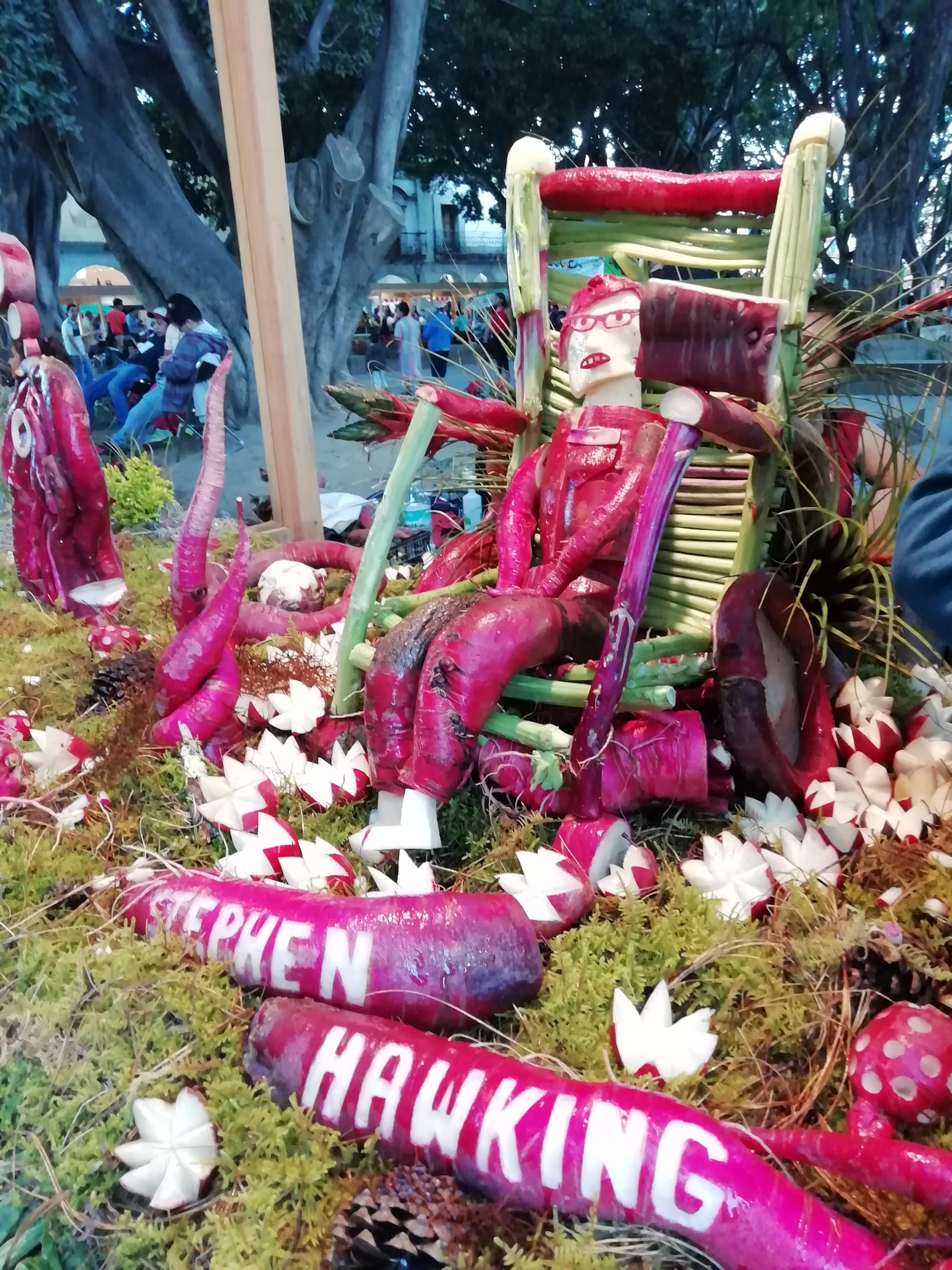 Every 23rd December there’s stand after stand of mini-dioramas, all fashioned out of carved radishes. Some tableaus depict the Nativity and religious characters, but the scenes are left to the creators’ imagination. By far the most bizarre in 2018 was an homage to the eminent British scientist Professor Stephen Hawking, complete with a wheelchair fashioned out of radish stalks. He even had a little tablet-screen (of radish skin, obviously!) attached to the arm of his wheelchair and tiny little spectacles (again, carved out of radish skin). Quite how the great man came to the attention of the Oaxacan radish carvers isn’t clear, but the whole event was a real treat: one of those fascinating ‘things’ that we stumble upon every now and then on our travels.