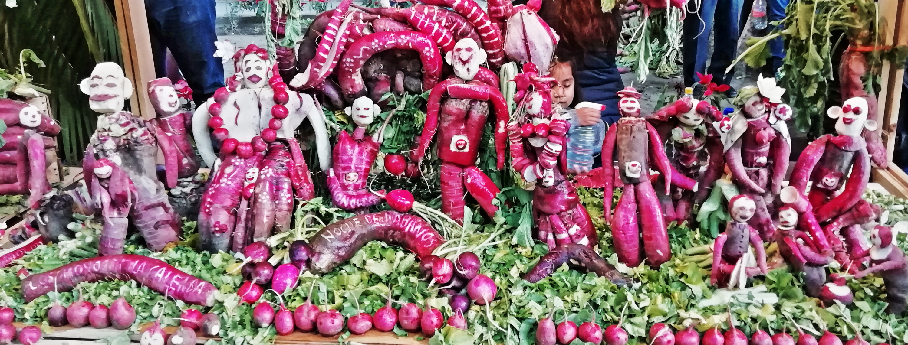 At this time of year, Oaxaca city obviously has the traditional Christmas tree in the main square. But in the curiosity stakes of the grand scheme of Christmas traditions, the ‘Noche de Rabanos’ (Night of Radishes) really takes some beating. For one day only, the craftspeople of Oaxaca go into a frenzy of radish carving. The results, of varying quality, are shown off to the public around the town’s main plaza.