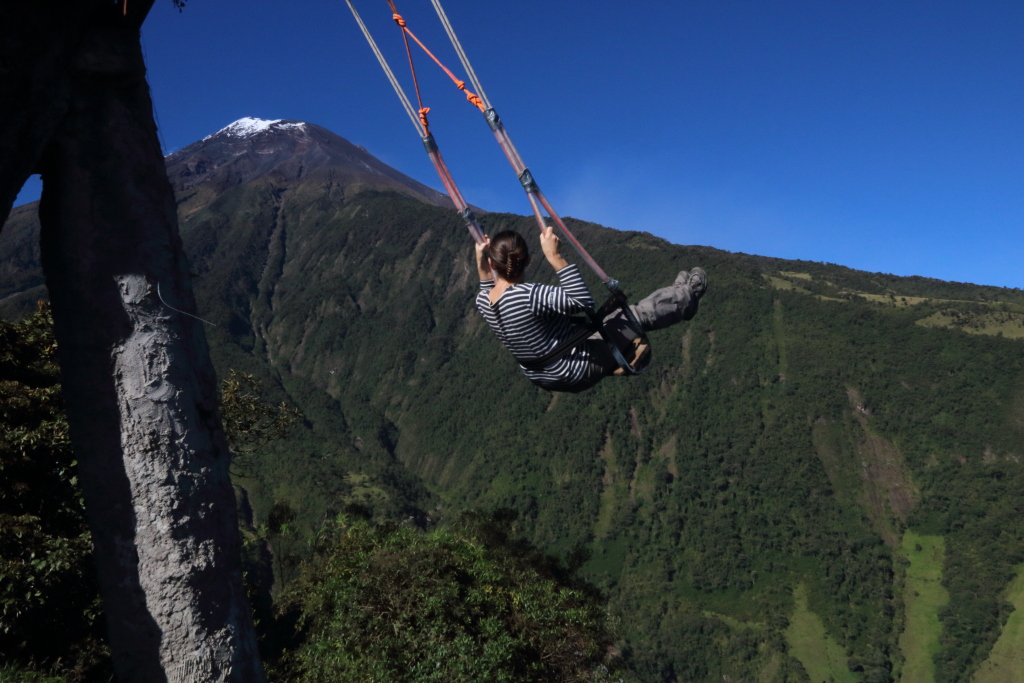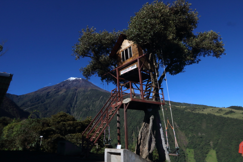 Another thing Baños is known for, is its spectacular tree swing. In travel-journalism dramatic fashion, it has been reported internationally as the ‘Swing at the End of the World’. Locally it’s known as ‘La Casa del Arból’ due to the small tree-house under which the swing hangs. The critical bit to note is that the tree sits on the edge of a steep drop-off and (when the view is clear of clouds) right in front of Volcán Tungurahua. The result is that when you swing out from under the tree, you appear to be launching off the ‘end of the world’ into a volcano. The swing has become so popular that it no longer hangs from the actual tree-branch; they’ve had to erect a metal branch-structure to take the strain of the usage. Nevertheless… worth a look, me thinks!
