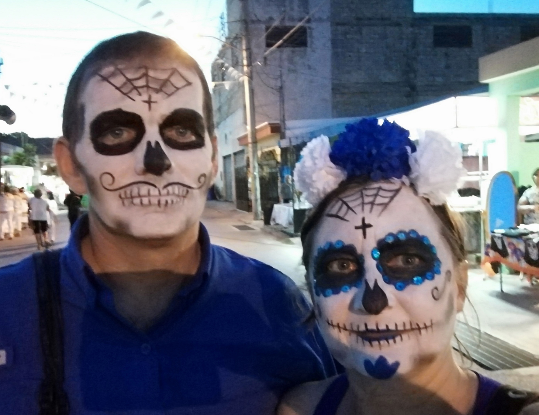 Oh well… that’s that then!  If there’s no parade to watch, we can just enjoy the vibe. And it is indeed a really great vibe. So many fabulous made-up faces and costumes. The atmosphere is a lovely combination of celebration and peace. Much jollity and good humour, but amongst it all, a certain feeling of calm. Crowds, but no rowdiness. Old people sit amongst younger relatives and reminisce by the altars (or shrines) that they have created outside their homes. With hindsight, maybe we had set our expectations too high. Maybe our ‘Emperor’ never intended to show-off any fine new robes… maybe he just wanted everyone to turn out to a street party. It was a bit of a disappointment, but we nevertheless had fun.