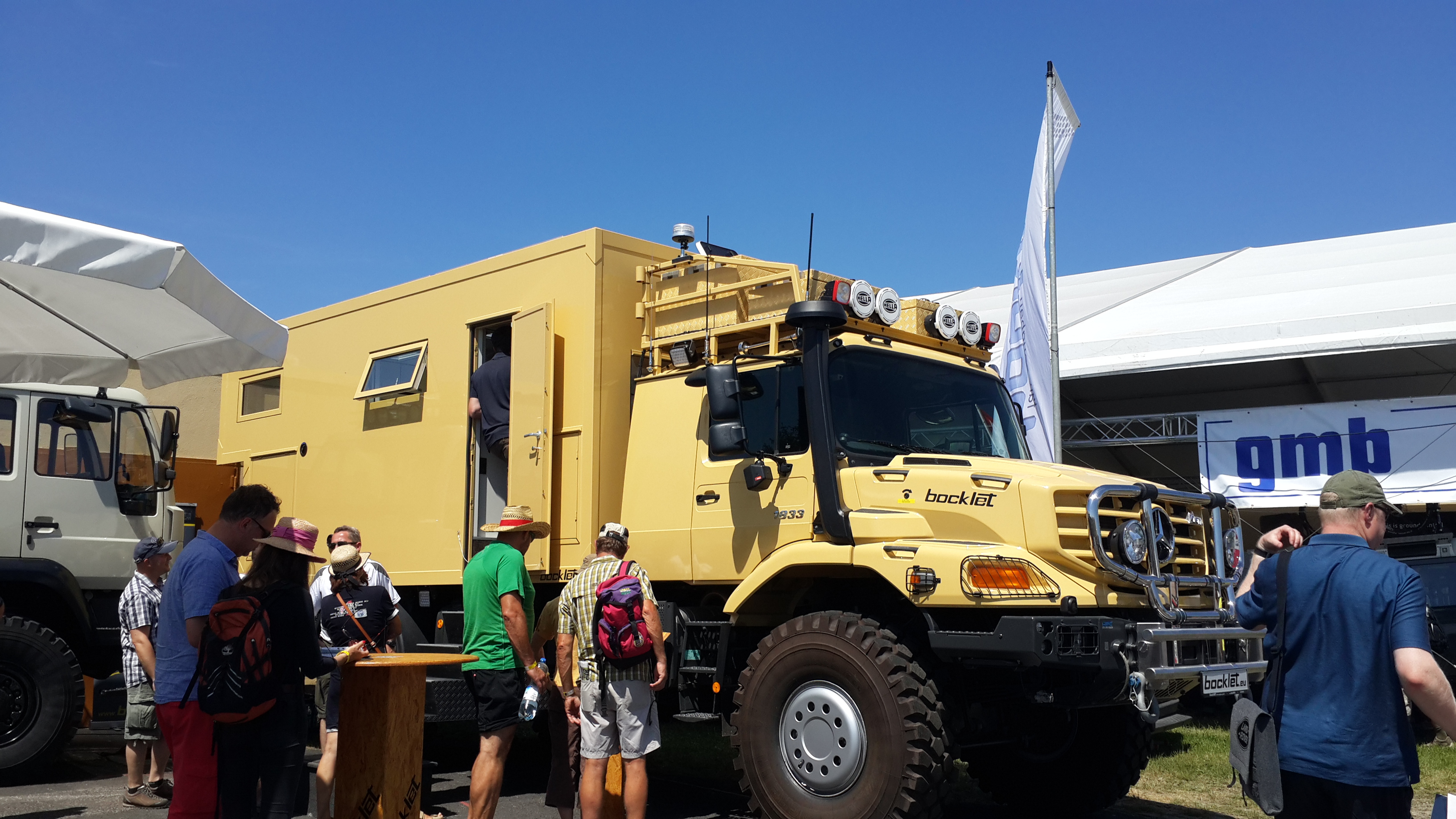 We had a great four days both at the show and at the very sociable camp-ground populated with like-minded overlanders. The weather was fabulous and we made lots of new friends. First we met up with our friends Peter & Heike (drivers of a Cuthbert sibling truck, the original Iveco Daily 4×4 camper-truck from Bocklet), then Roger & Sue from the Silk Route Club (Sue freshly arrived from a stupendous overland cycle from Cairo to Cape Town – big respect!). The next day Darren and Clare from Bimobil UK parked up next to us and proved to be a poor influence on our alcohol consumption over the next 3 days! On the Friday evening, relaxing with a beer outside Cuthbert, a friendly voice came from behind us: “Allo… Markuus?” Some very nice Cuthbert fans from France, Co and Eric have recently bought a camper-truck similar to Cuthbert for a forthcoming trip around Africa and been following our travel blog over the last year. We were very pleased to meet them and have arranged to visit them in Reims later this summer. Very sociable this overlanding stuff!! 🙂