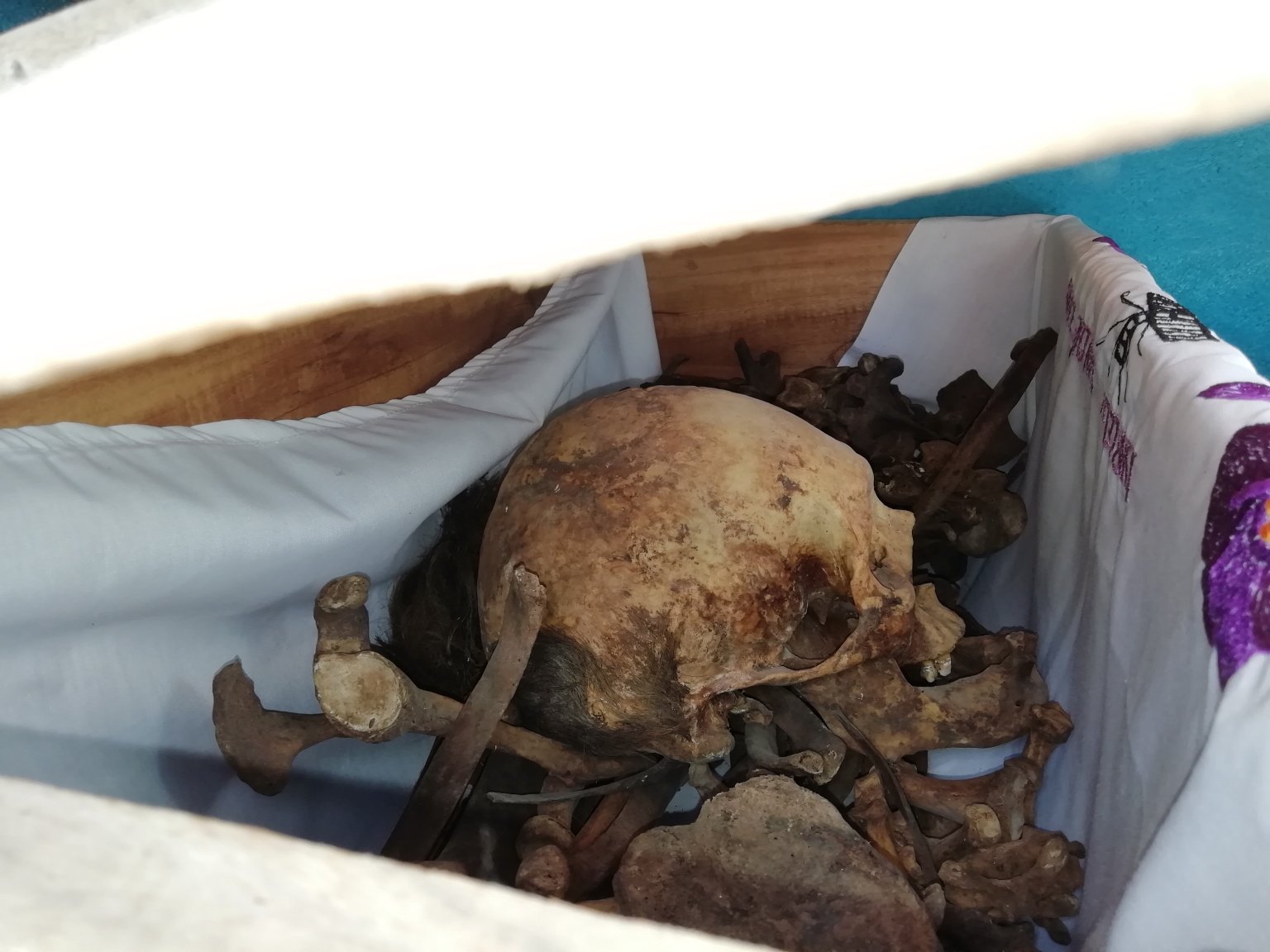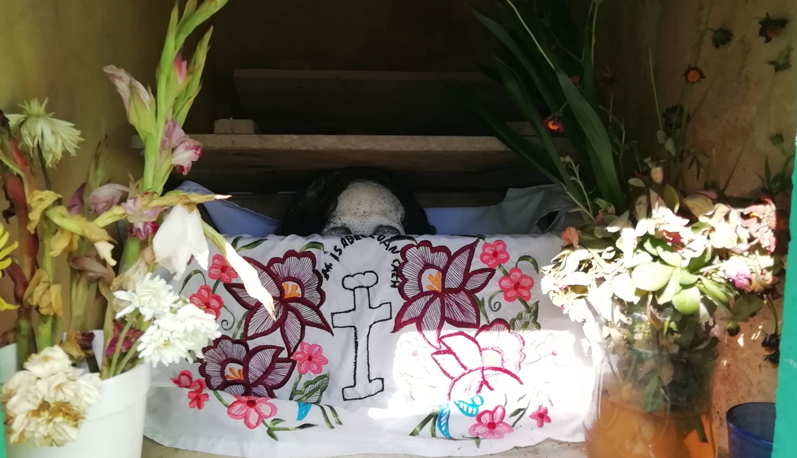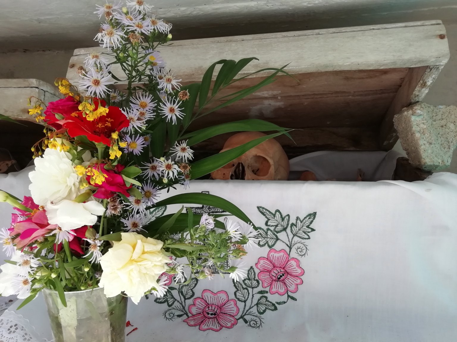 Here in Pomuch, they don’t merely symbolically bring their loved ones, in their hearts, minds and images to the celebrations…. no. Here, they actually exhume the bones of the loved ones! A minimum of three years after burial, the bones are removed from their graves, cleaned up and displayed in a box on an embroidered white linen cloth. And some of them are not simply just cleaned up. Some of the skulls are even dressed-up, with wigs of real human hair to help them look their best. For the first year for a corpse, the bone-cleaning exercise is a major task. In following years, they are simply brought out, dusted-off and re-presented on a clean new cloth.