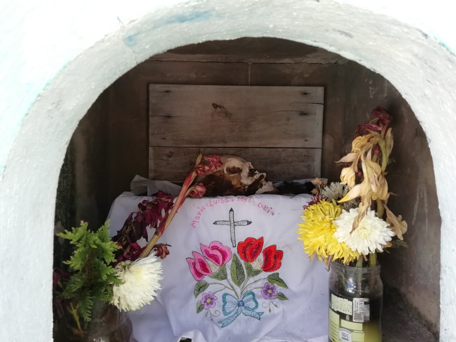 We had read about this curious practice and were a bit unsure whether to go see it or not. But some 10 days after Day of the Dead, we happened to be driving right past Pomuch on our way to Campeche. Our curiosity got the better of us and we pulled over. In the ramshackle cemetery we saw the boxes on most of the graves, the bones displayed to varying degrees of neatness. Some of the graves had family in attendance, neatening the display of their loved ones’ bones and straightening the wigs. [click here to read a bit more about the Pomuch tradition]