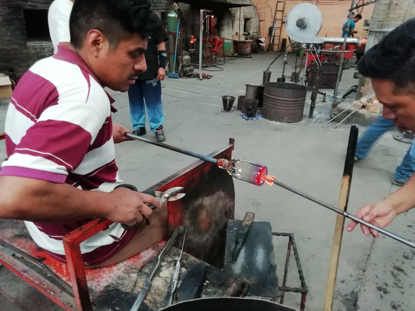 - watching glass-blowing at the Canter community factory (no ‘elf ‘n safety here, we were left to wander freely around the workshop, amongst the furnaces and red-hot blobs of molten glass being waved around as they’re formed into bottle-shapes)