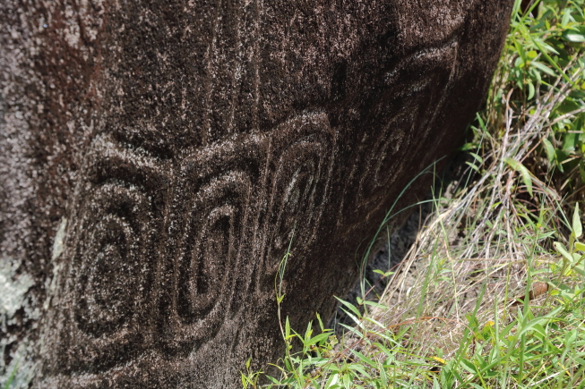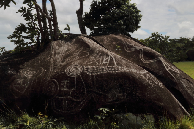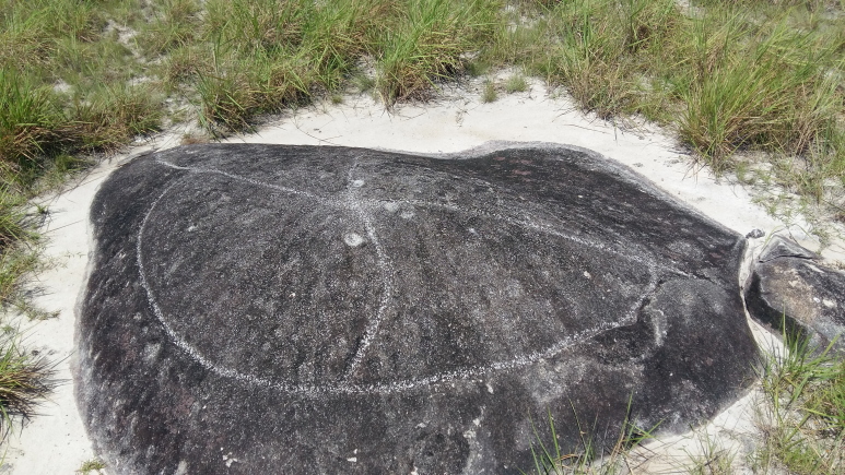 Finally, after a couple of days exploring, we arrive in Aishalton. We report to the Tuschau (the village chief) who welcomes us and asks guide Martin to show us to the ancient petroglyphs. Just a short drive through swampy bushland from the village are scattered some extraordinary decorated, granite mounds, thought to be around 7,000 years old. The Amerindian carvings are deep and very clear in the granite. Well! Who knew Guyana had such a treasure?