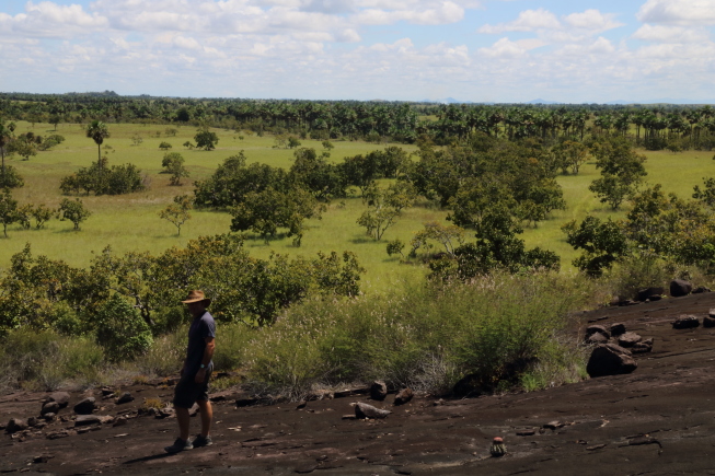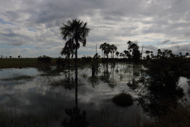 Habitation is very sparse out here in the Rupununi savannah. Between the few scattered communities we see very few people. The route crosses some idyllic streams along the way; it would be rude not to stop for a swim and admire the scenery from the water 🙂 . The big-sky scenery just goes on and on. The further south we go, the better it gets! Views all the way to a horizon where the bright emerald green, palm-dotted grasslands meet an azure blue sky, scattered with enormous puffed-up clouds.