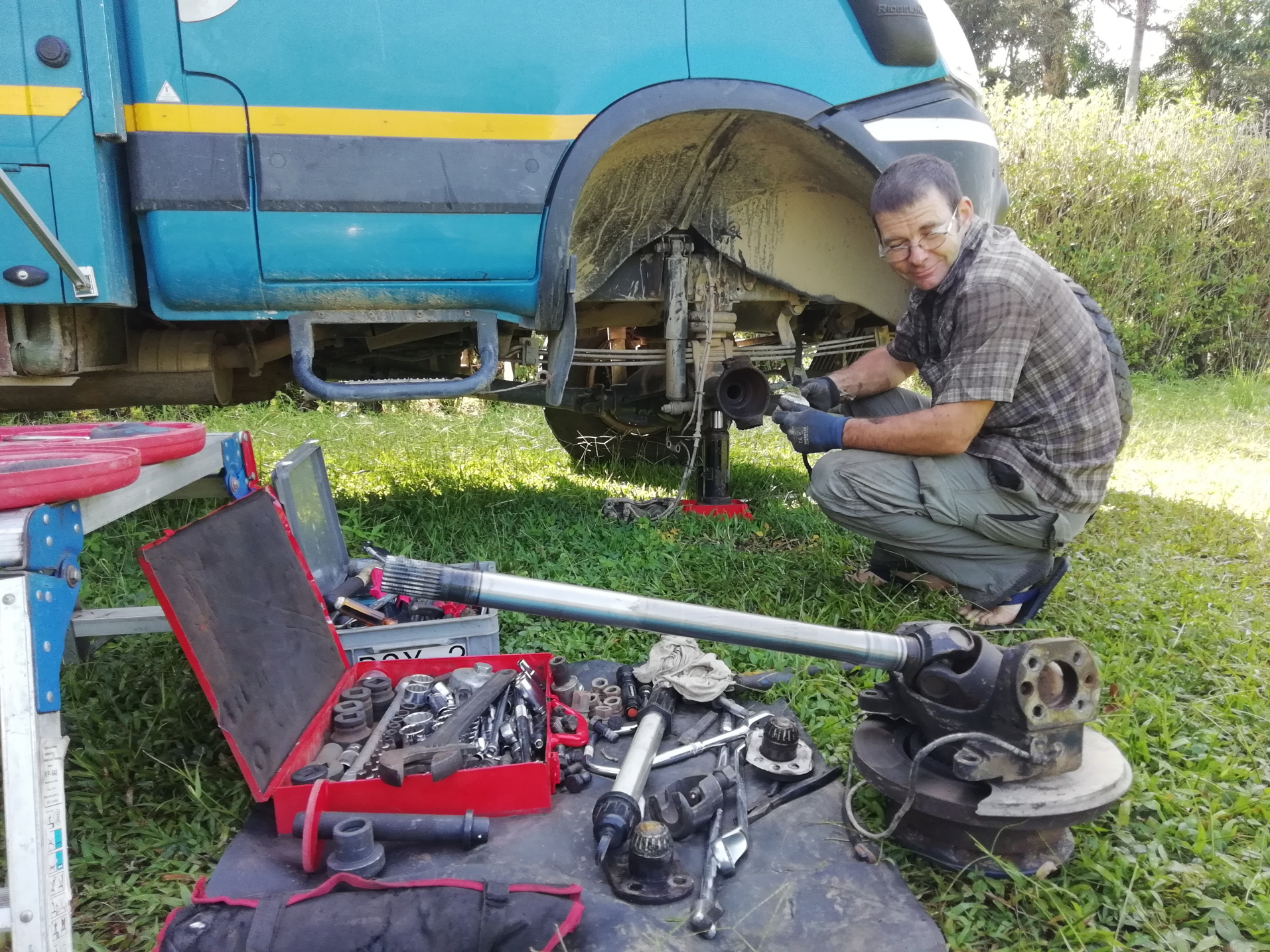 First, Marcus wanted to do some maintenance on Cuthbert and he hates spreading all his tools out in a wild-camp area. Yes, he’s done a couple of roadside fixes, but that’s a ‘bodge-it-and-scarper’ kind of scenario. Here, he wanted time and space to completely disassemble the front near-side wheel-hub to fix a leaky seal. He needed to have all the kit out without worrying about inquisitive local kids prodding around in the tool box.