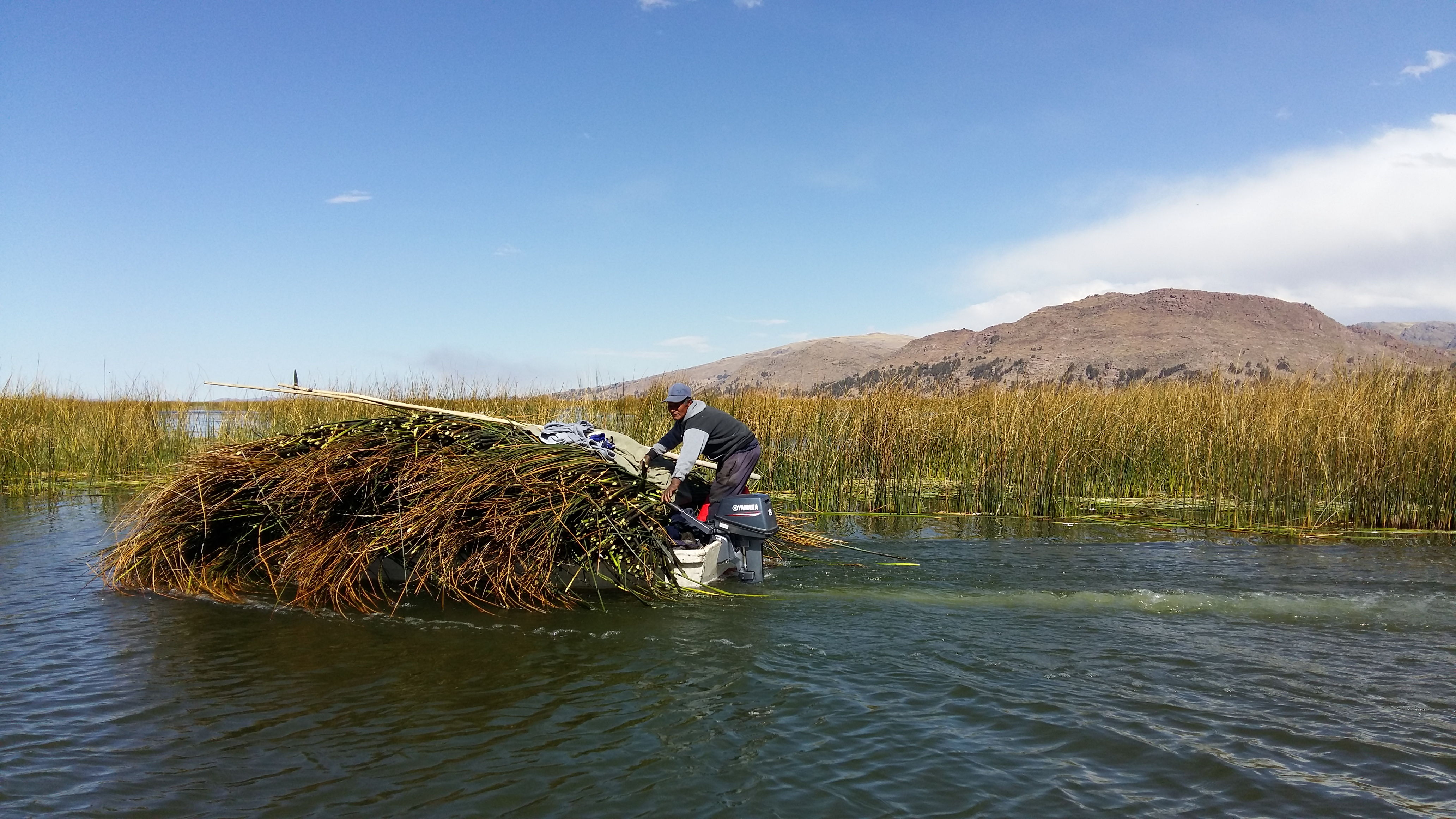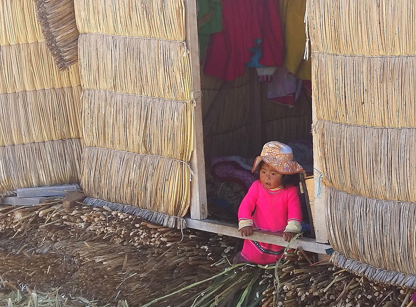 We’ve painted a fairly negative picture of the experience but there were of course some interesting bits too. There is the sensation of stepping off the boat onto the surface of the reed island. They’re made from layer upon layer of reeds harvested from around the lake-shore and you sink gently into the softness as you walk around (whilst we were there, boats arrived stacked high with new bundles of reeds to replenish the flooring). We saw how the people carefully retain constant fires for cooking and how they keep tiny trout-farms off the side of the island. The huts on the island appear on first glance to be made of reeds, and the older round-shaped huts still are. However, the newer square-shaped huts are now mostly frames of corrugated iron, clad with reed panels; partly for warmth, but also to appear more authentic.
