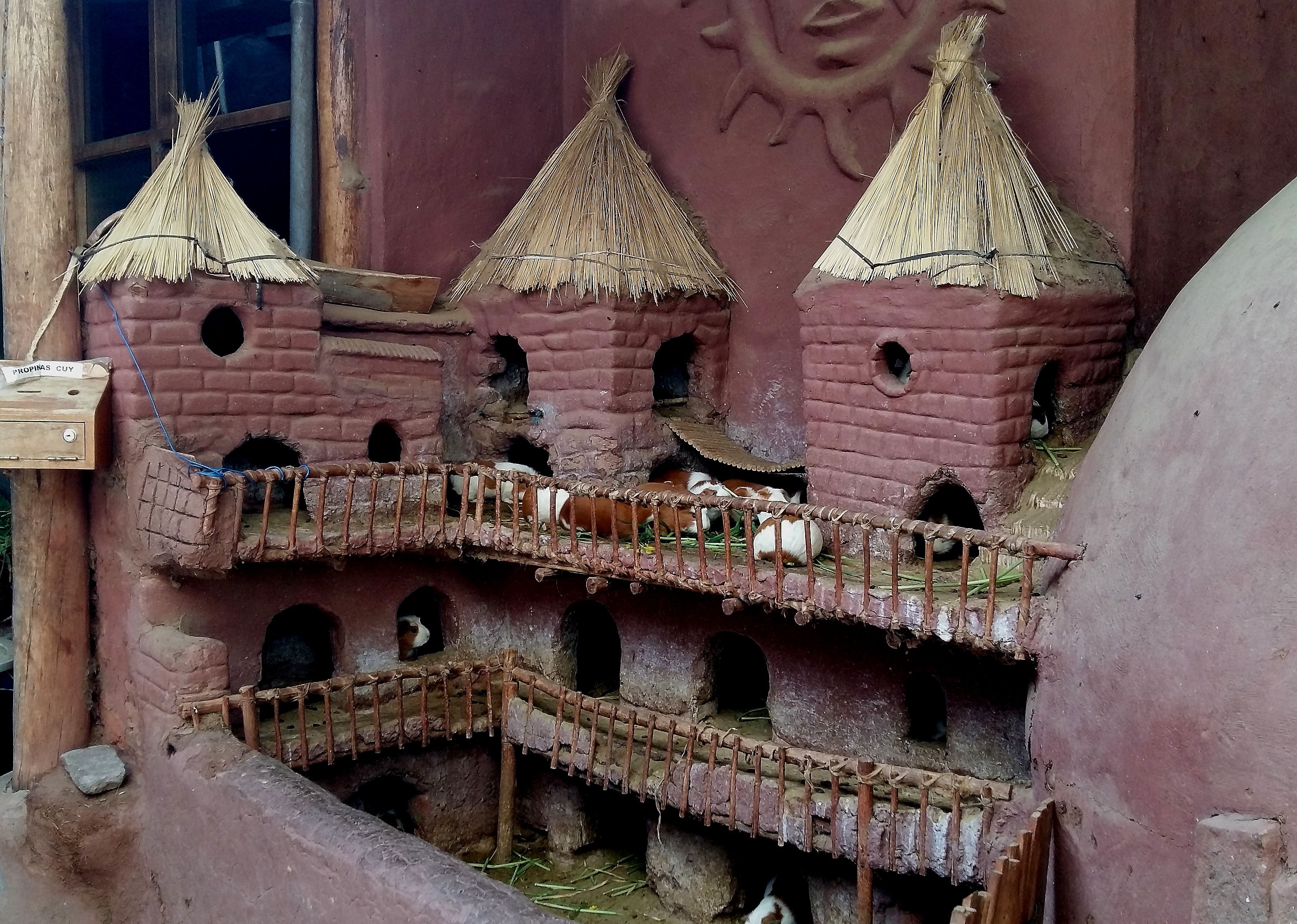 So we head happily back to Cusco and on the way we see one of those pick-your-own guinea pig places. No, not a pet-shop, a restaurant! Just like in those seafood restaurants where you pick a lobster and have it grilled to order, here you study the pink Guinea Pig Palace and select your little furry chum for lunch 😛 Personally, I can’t face a meal where cute little Gus the Guinea Pig is staring up at me from the plate, but it’s really a delicacy here. Marcus had tried it a few days before so we didn’t stop to eat here, but we couldn’t resist the photo-opportunity.