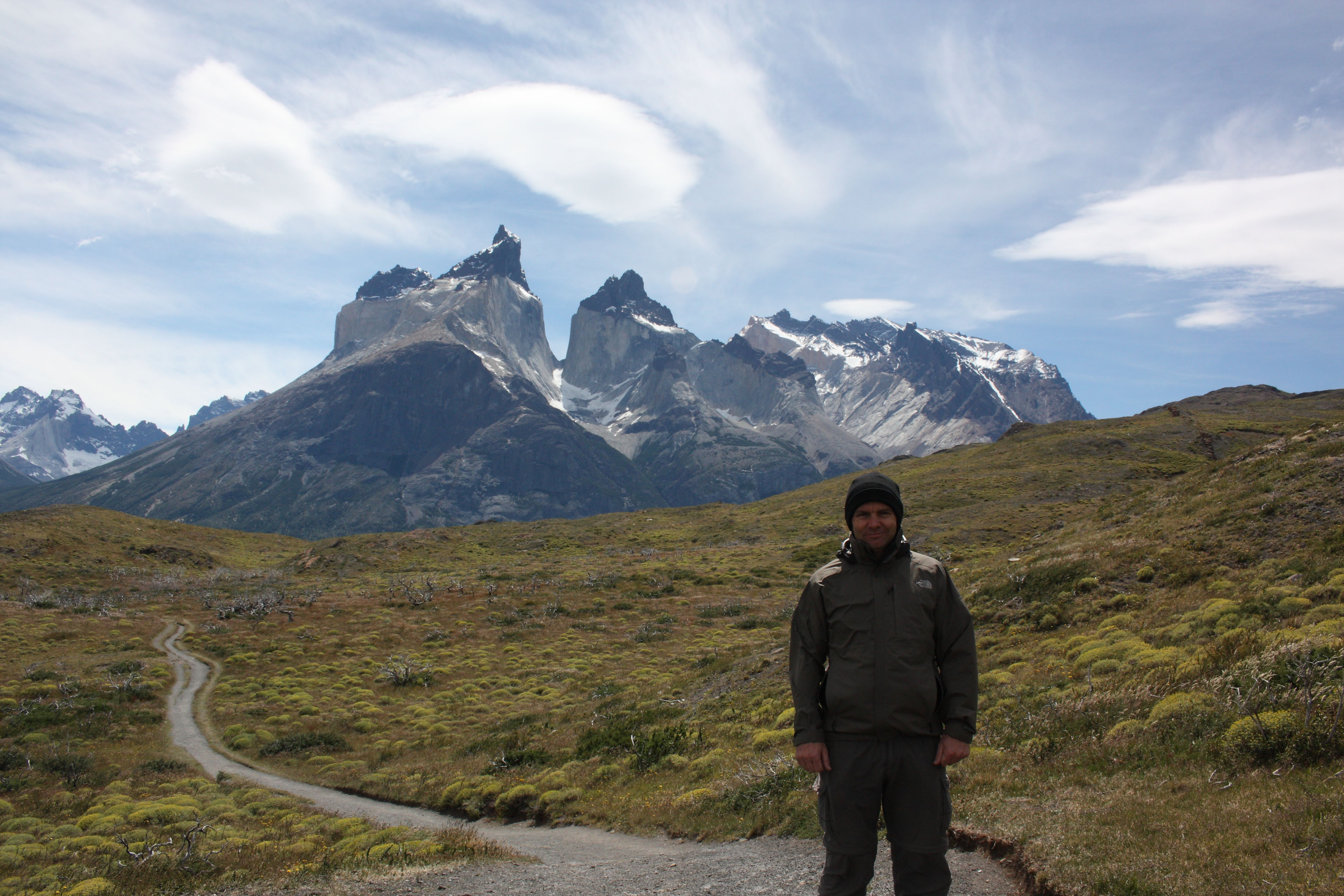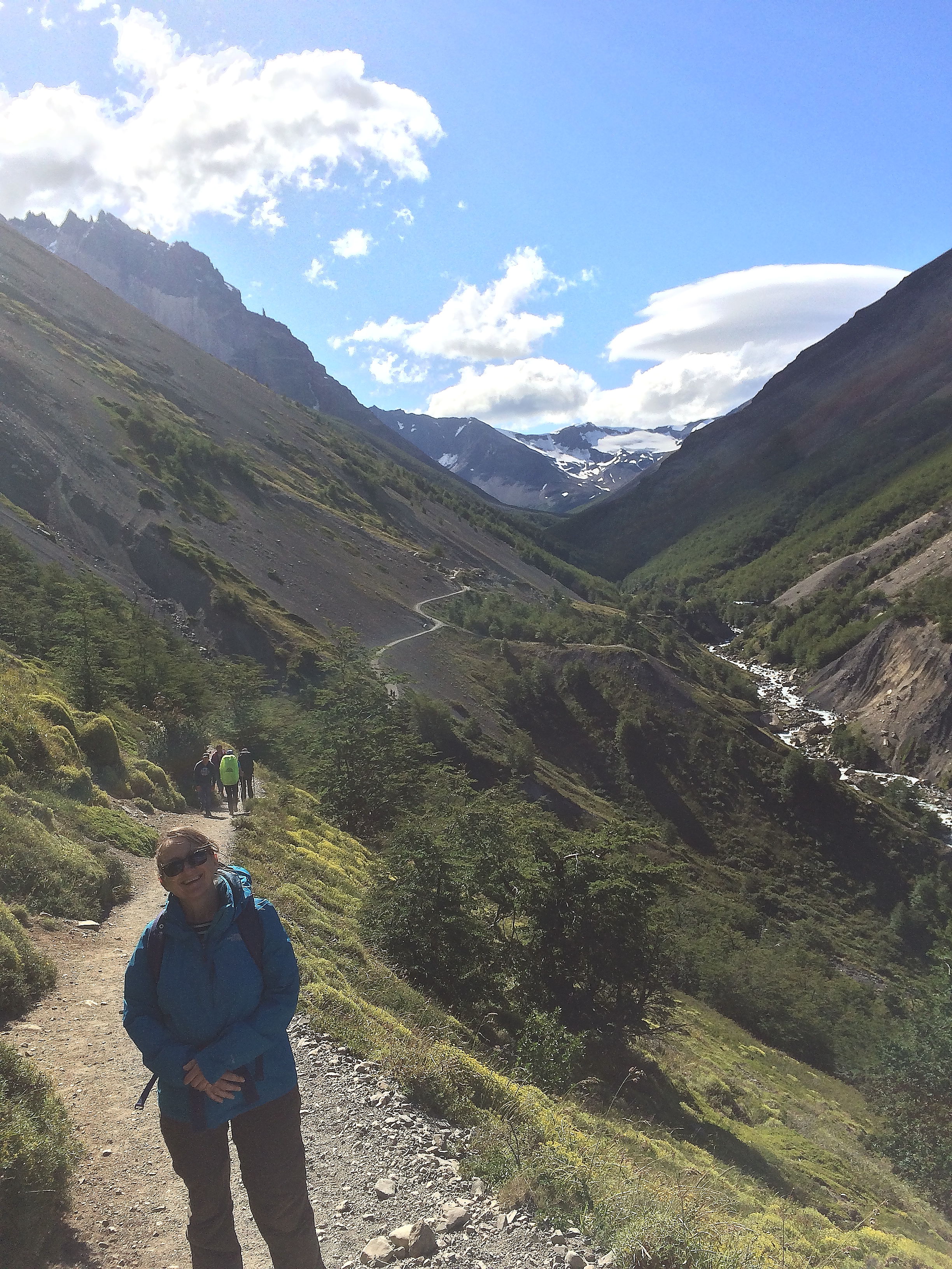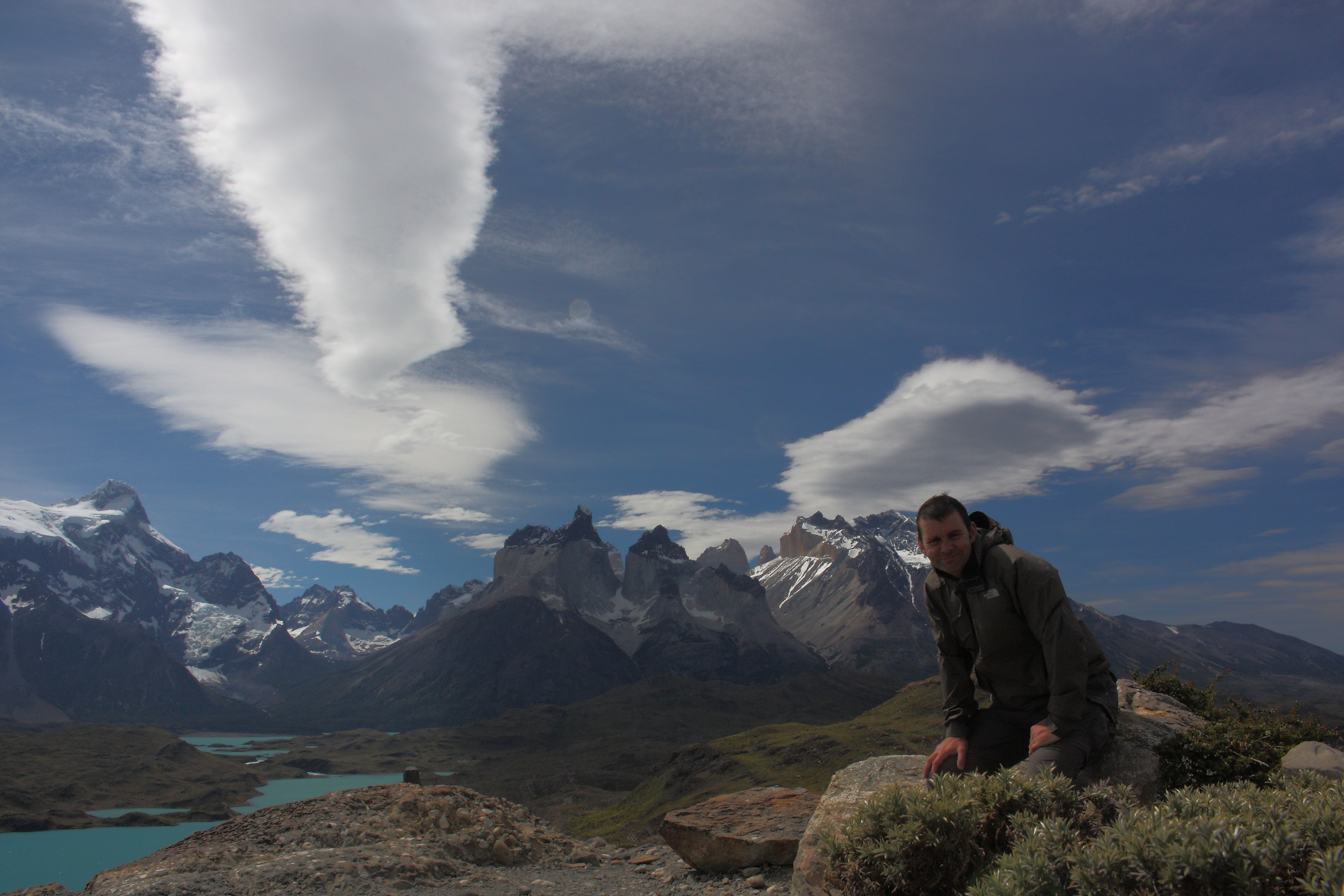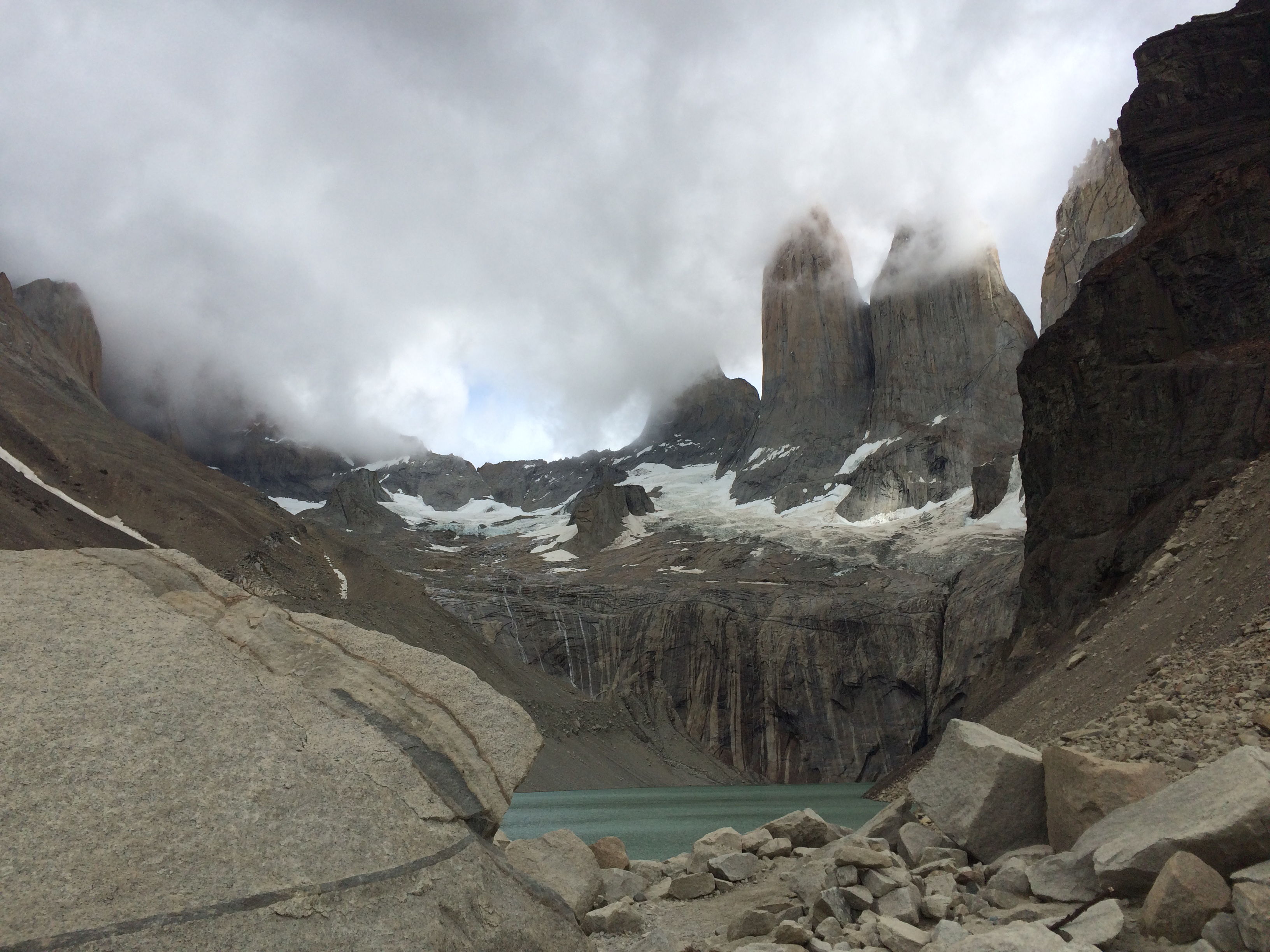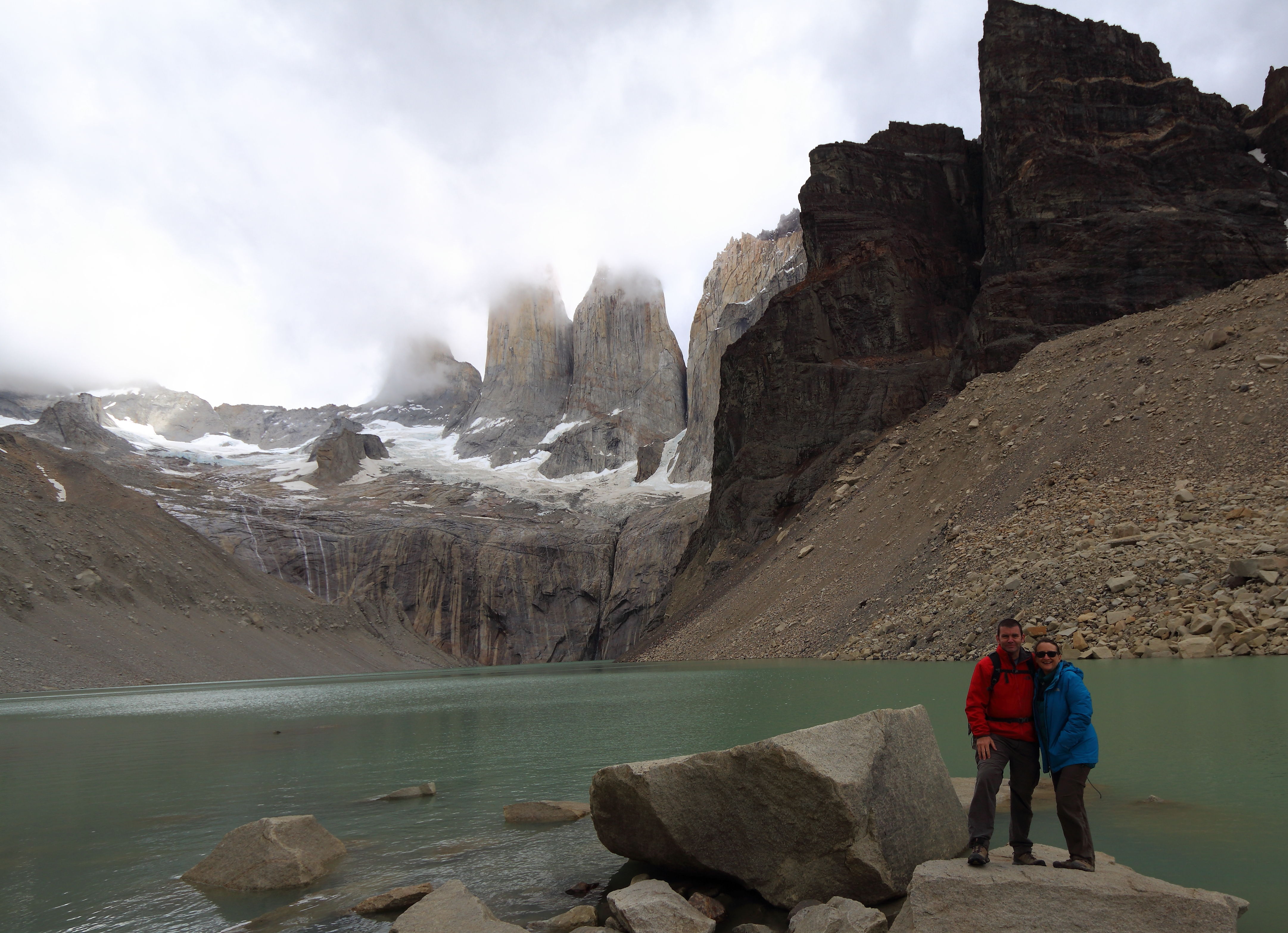 We enjoyed several of the Park’s short day-hikes, but one of the longer day-hikes that we were not prepared to miss, is up to the base of ‘The Torres’ – the three granite peaks after which the Park is named. It’s a three and a half hour 7km continuous steady climb up 500m to the base of the moraine, then a final one-hour, steep clamber up 300m along the edge of the moraine to reach the crater pool over which the granite Towers stand guard. The Towers, rather rudely, stayed hidden behind the cloud for our time there. It’s no way to treat someone who has generously hiked so far to see you, but there was very little hint of them coming out to introduce themselves properly. To rub salt into our wound, when we descended the moraine and glanced back up to the peaks, they were in clear blue open sky with hardly a cloud to be seen!!! Bugger! We still had a long (knee-killing) descent ahead of us to get back to Cuthbert, so we were not even going to consider re-climbing the moraine to see The Towers properly in the sunshine! ‘Sod’s Law’ says that if we had waited up there to see if the clouds would shift, the sky would almost certainly have remained grey for the next 5 hours 🙁 !!! Nevertheless, we had a great day and they were still a beautiful sight.