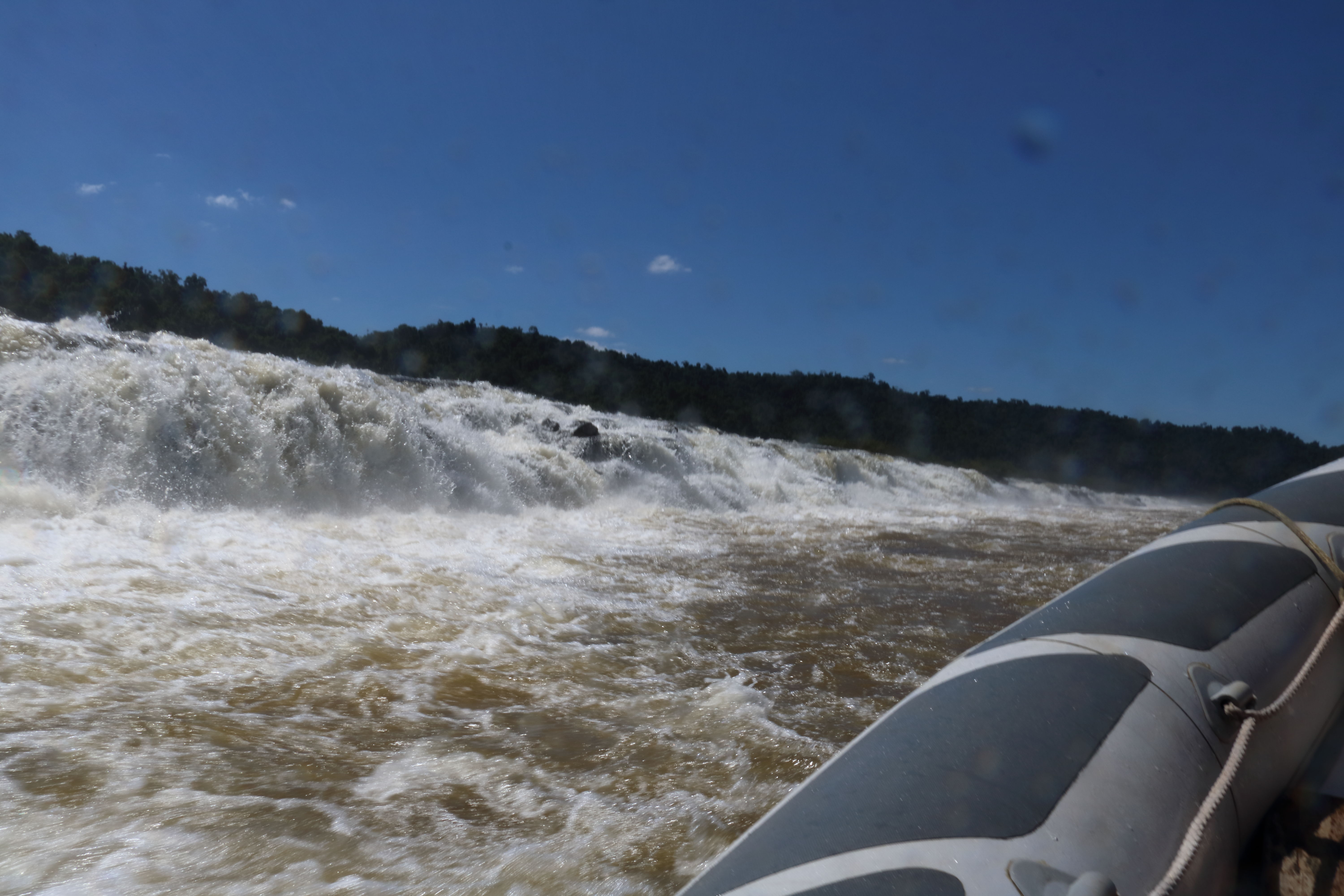 As the boat bounces over the rapids, it’s a cool sight to approach the beginning of the line of waterfalls. But then we continue the rough ride, further and further up-stream past the continuing line of waterfalls, over three kilometres!! It’s an exciting ride: the boat handler skilfully drives the zodiac along and then into the falls as if riding up into the cascading water and we cling on to the side-ropes whilst receiving a soaking. It’s a hot, sunny day with temperatures around 35C, so it takes only seconds to dry-out when we get back to shore.