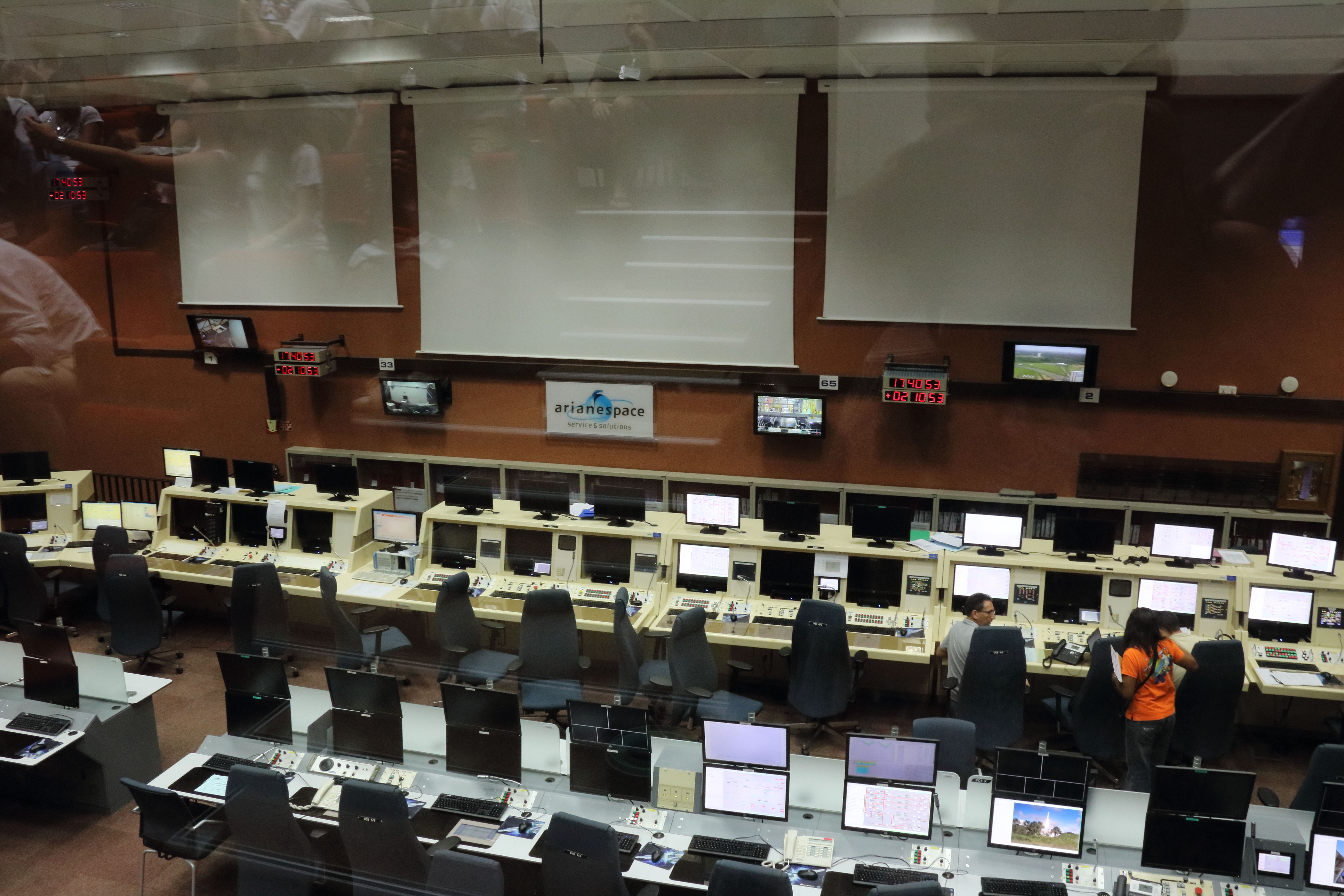 The Agami site has huge screens set-up at the side so we can see what is going on in the control room. We receive mission updates and explanations of the phases: launch, jettison, mission monitoring, satellite deployment etc, etc, etc.
