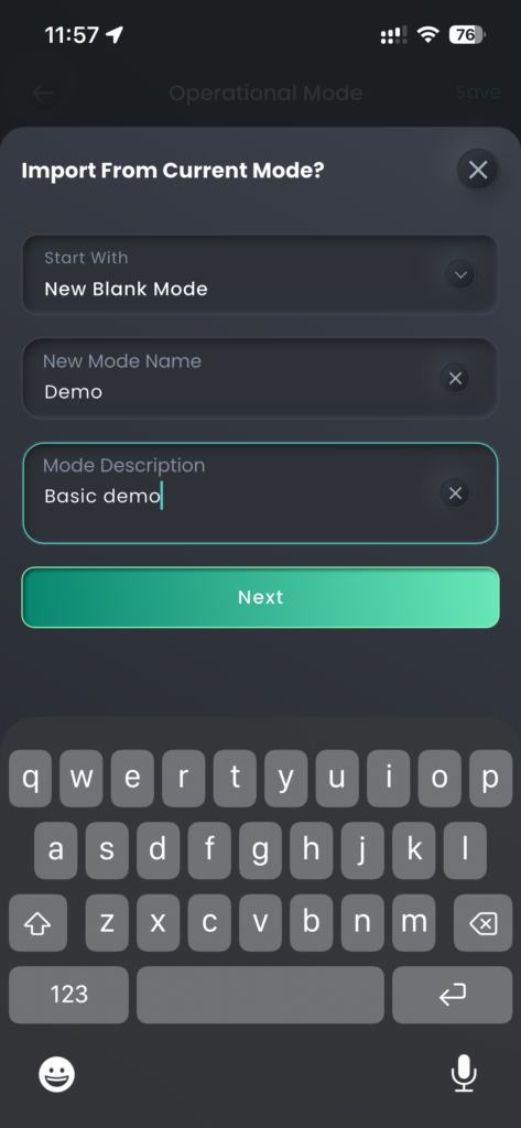 In the app on the home screen, tap on Current Mode, then on the next page Current Mode again. There is now a list of Operating Modes, the one that is in use will have a green round circle with a tick in it. To change modes simply tap into the blank hole of the mode you would like to use, it will turn green and save. To create a new Mode select + Add at the bottom of the page.