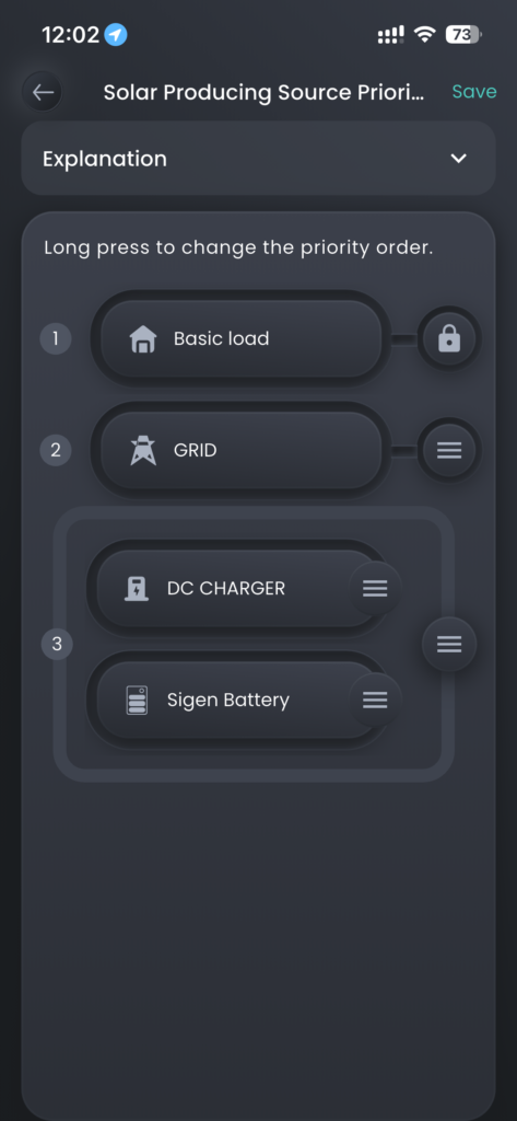 First setting to set is the Solar Producing Source Priority. Set it to 1. Basic load, 2. Grid, 3. Sigen Battery, then save. This will export excess solar to grid. Note: as I have a DC Charger it is shown with my Sigen Battery, you may not have this.