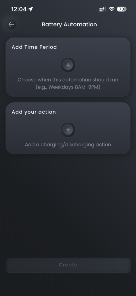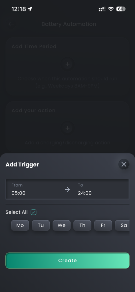 Next select Battery Automation, now we are going to build up the various time periods for the day. First, we are going to Add Time Period and set it to 00:00 to 02:00 and set the Select All box so it does it for every day of the week and then Create.