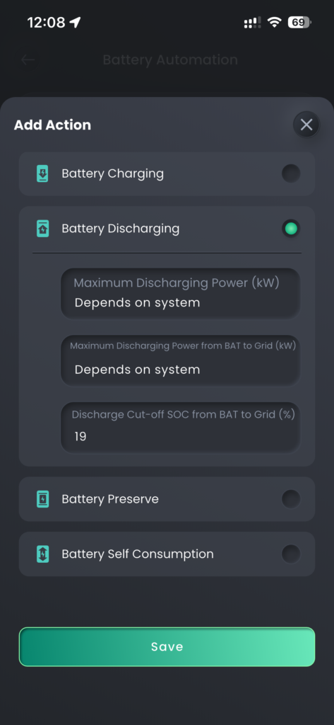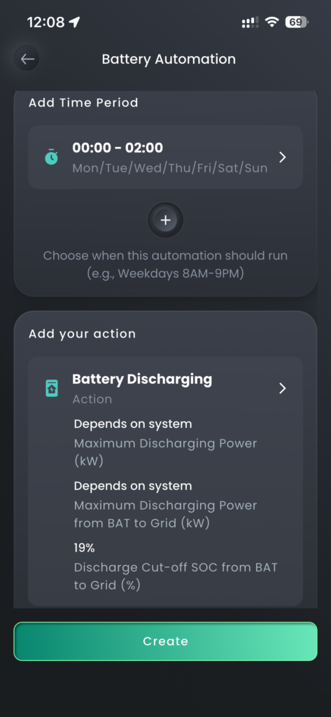 Now Add your action and select Battery Discharging, the discharging powers can both be left set to Depends on system, set the Discharge Cut-off SOC from BAT to Grid to 19% and save, then Create. That is the first time period set.