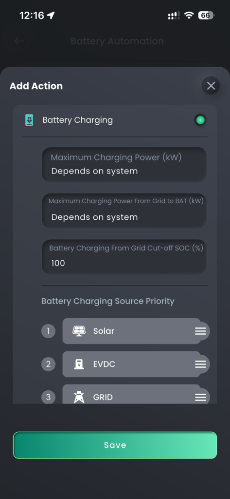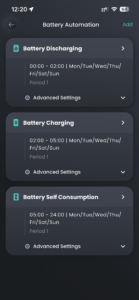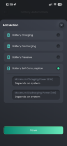 Now Add your action and select Battery Self Consumption and leave the default settings and Save, then Create. You can see the 3 time periods and what they are set too, now select the back arrow top left and then Save.