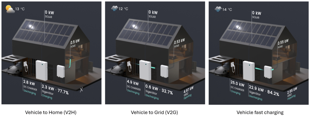 The Sigenergy DC EV charger (Sigen EVDC module) is bidirectional: charges the car and can discharge from car to house/grid (Vehicle-to-Home V2H or Vehicle-to-Grid V2G) and uses a CCS2 plug.