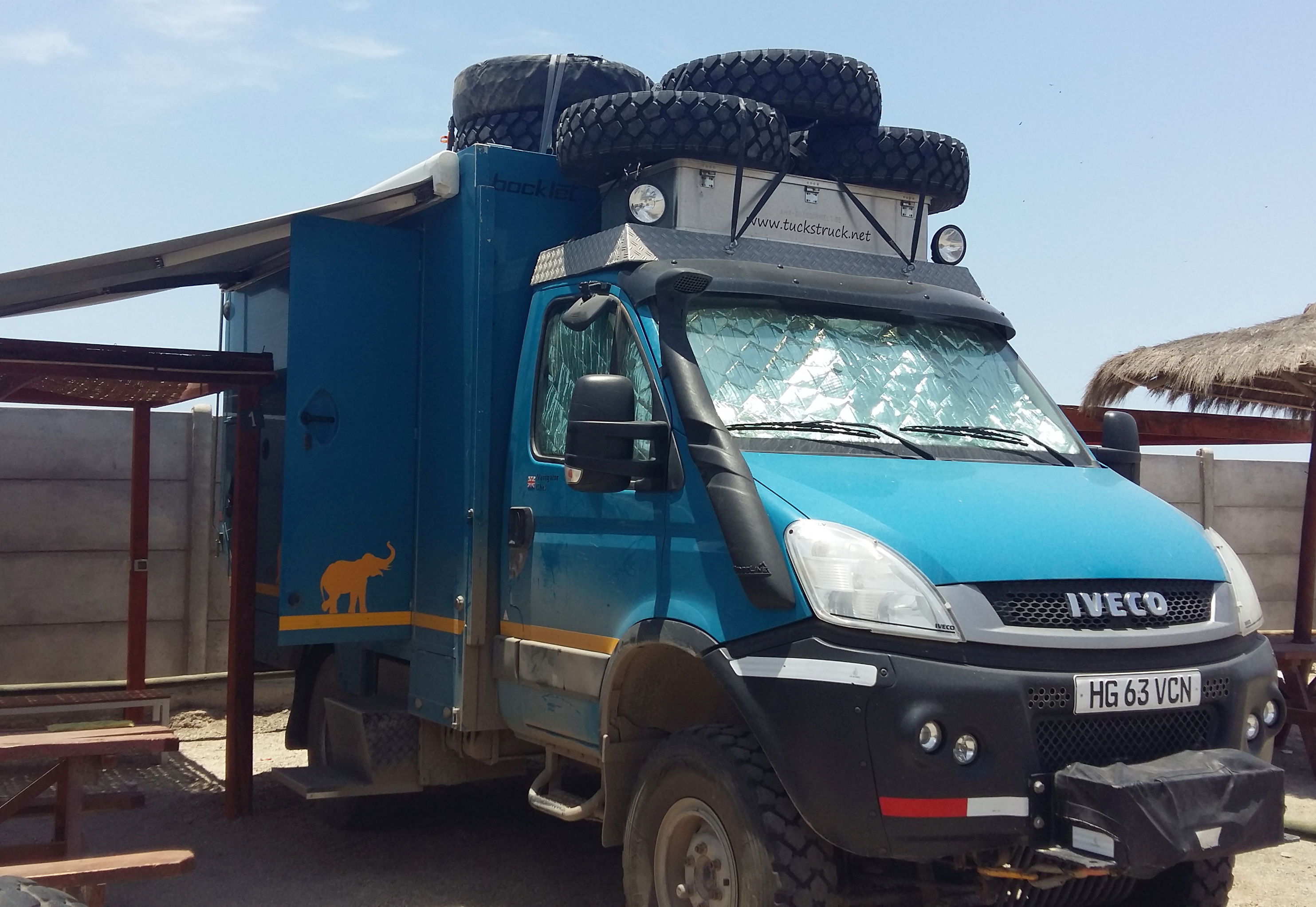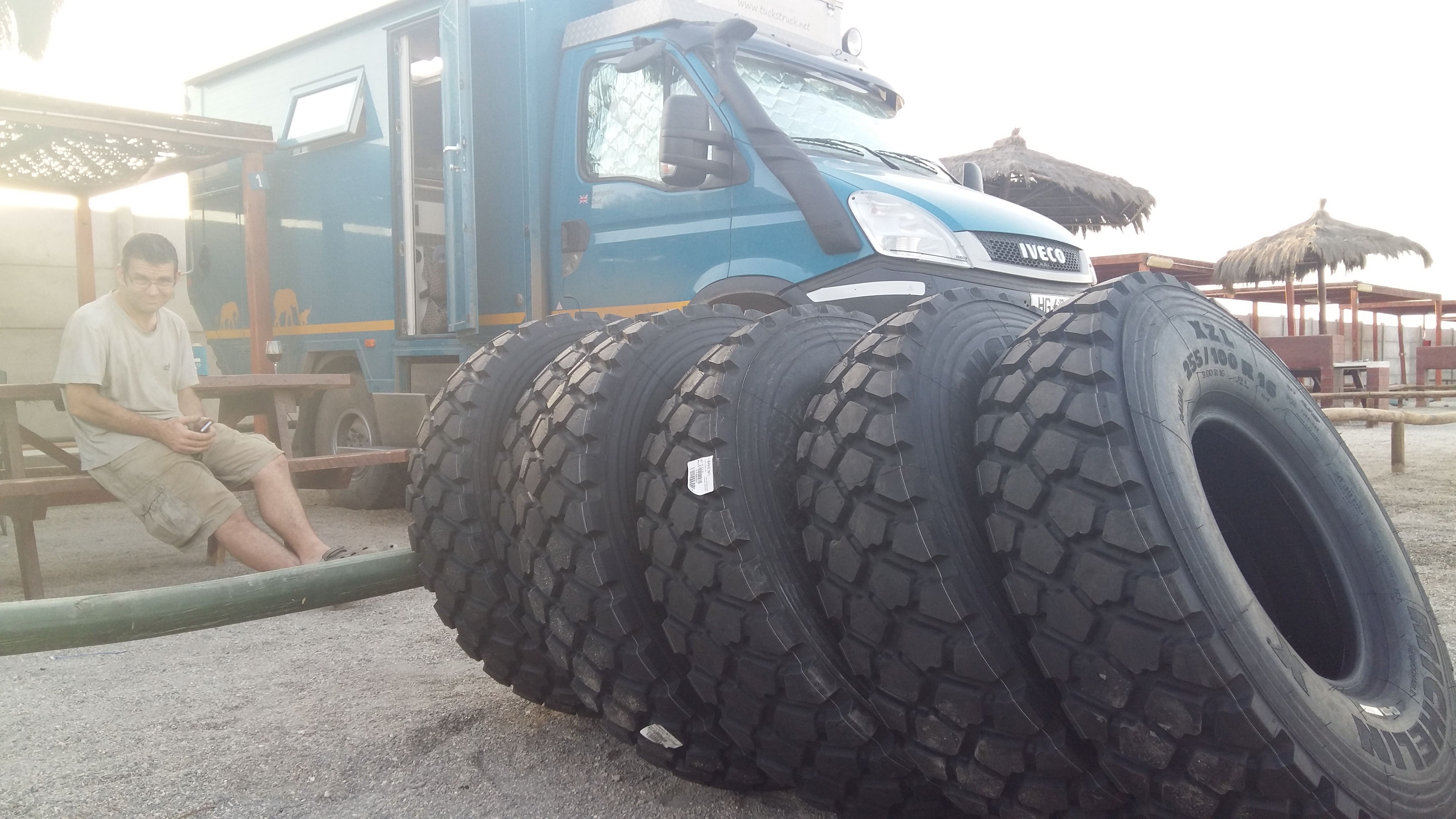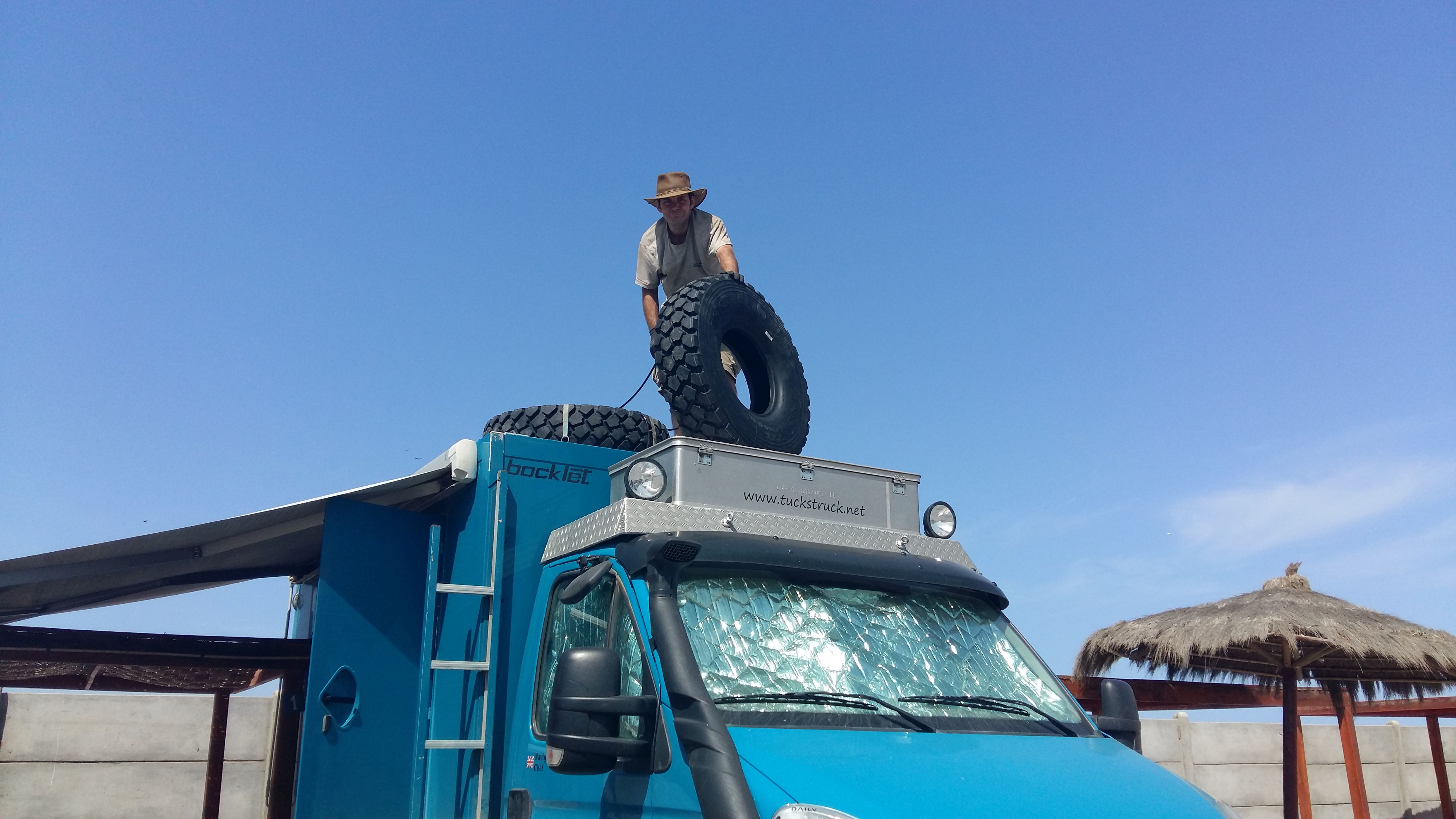 We can just about carry the new tyres scattered about Cuthbert’s person, but the extra weight of six new tyres (plus the two existing spares) at 40kg each, limits the amount of water and/or fuel that we can carry at the same time. Weight-wise, the rear axle is Cuthbert ‘achilles heel’. With the weight of all the tools in the rear storage locker and the 230 litre water tank sitting aft of centre, we really don’t want to add any of the new tyre-weight to the rear axle if we can help it. This is one of those ‘problems’ that we had been conscious of for a while, but been putting to the back of our minds in the category of ‘Cross that bridge when we come to it’. Hmmmm….