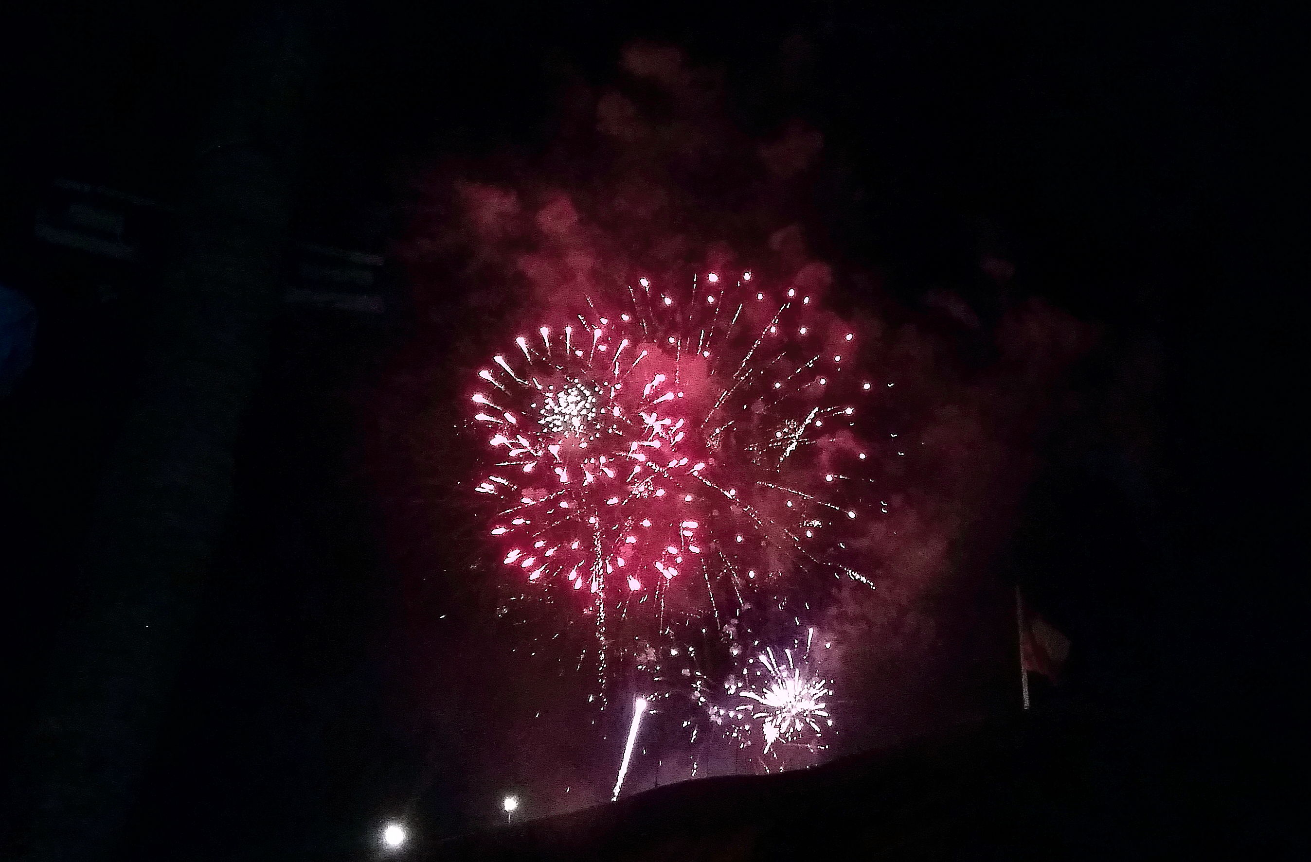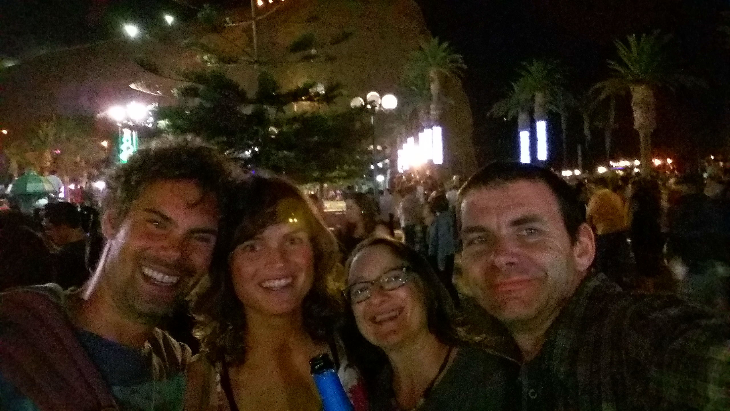 As we reach the plaza, a mini-pop concert is underway and the crowds feature two main activities. First – firecrackers. Not merely the little ‘jumping-jack’ variety… these are huge explosive devices of the kind restricted in the UK mostly to military exercises on Salisbury Plain 🙂 ! They’re detonated at random angles, often flying unpredictably towards unsuspecting heads in the crowd, flashing brightly and making deafening cracks of sound booming around the square. All good fun… until one hits you! The second entertainment activity of the crowd is to let fly those coloured bag things into the air. I’m not sure what they’re called… they’re simple contraptions with a flame suspended inside the bag to generate heat and lift to send them soaring prettily into the night sky. Sounds fairly innocuous… but these are launched in a plaza criss-crossed with overhead electric cables and surrounded by parched palm trees. What could possibly go wrong here then? There is gentle breeze which is, of course, not accounted for by the launch parties and (rather predictably, we thought) many of the flying-burn-bags drift into and set alight to the overhead electric cables. These burn rather well for a while. The crowd looks up and gasps, steps aside briefly, then carries on partying under the burning wires. It’s a fun atmosphere, but you need your wits about you here!