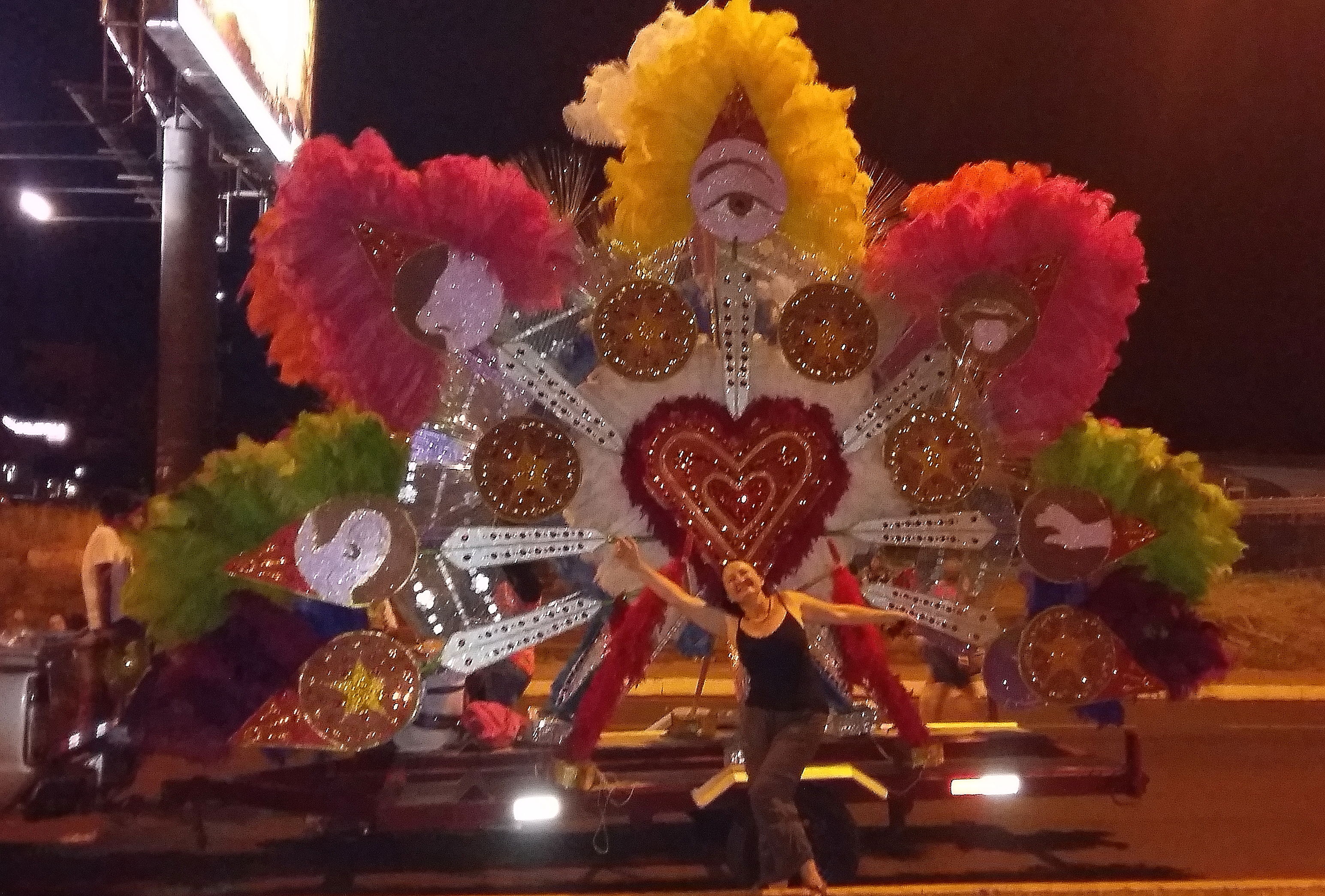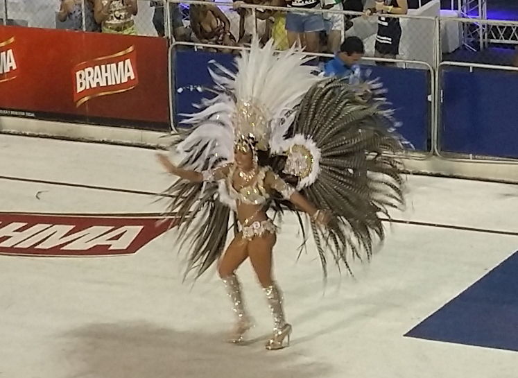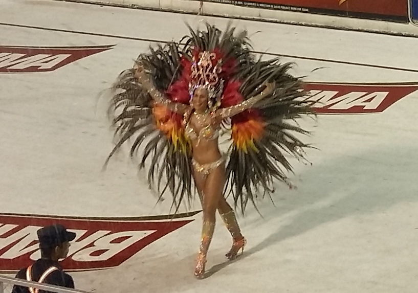 Ever heard of a ‘Sambadrome’? We hadn’t either. Read and learn 🙂 It’s a dedicated Carnival party-zone; a permanent structure featuring a sort of artificial street down which all the sparkly Carnival dancers and floats can parade past terraces full of revelling spectators. We buy a ticket and join the queue, but not sure what to expect of this ‘canned’ version of a street party.