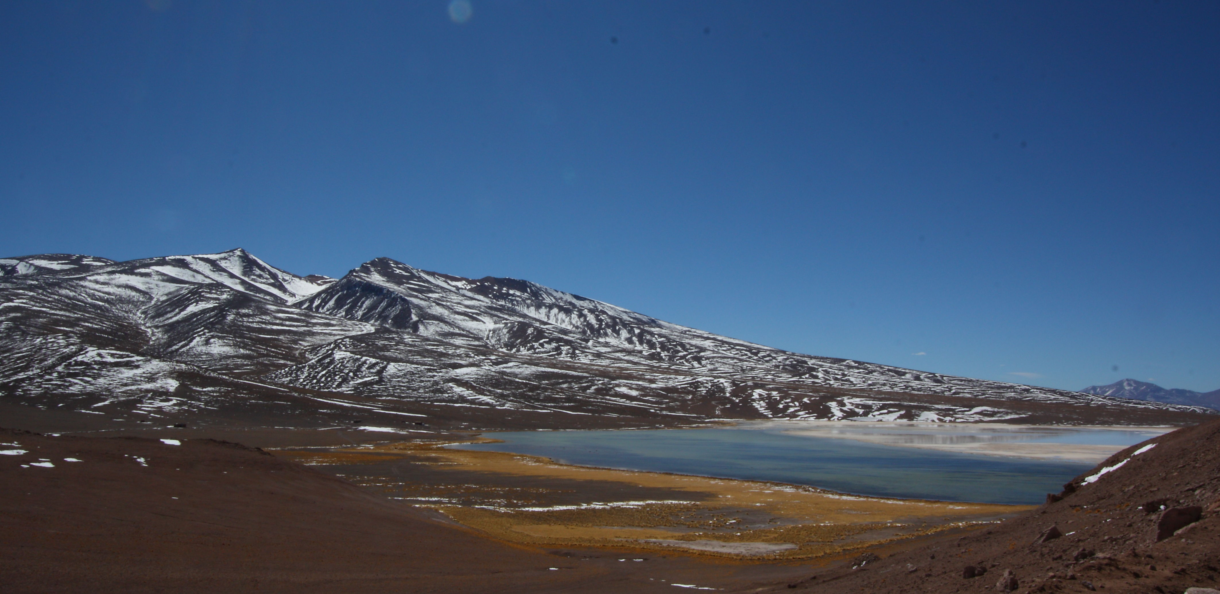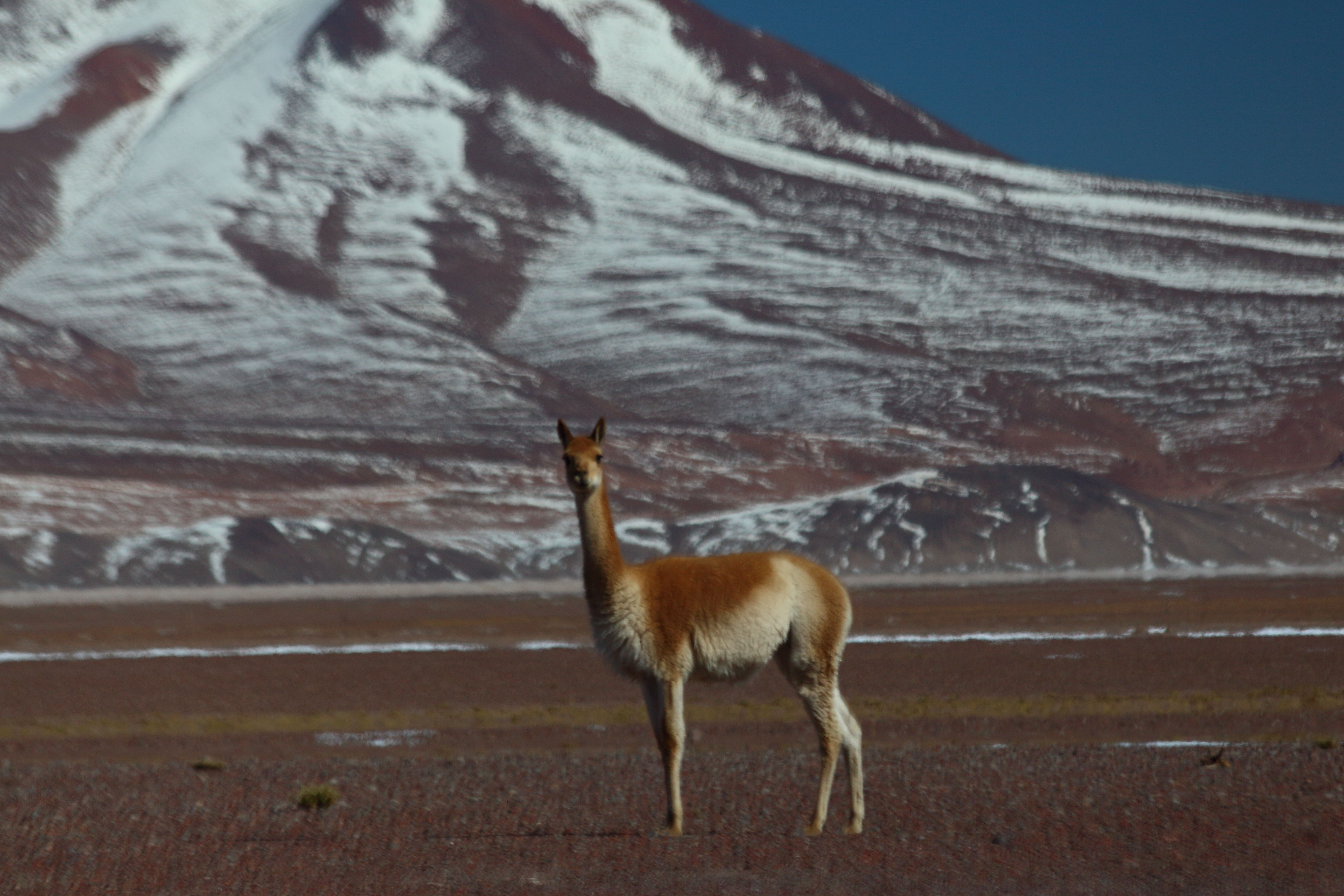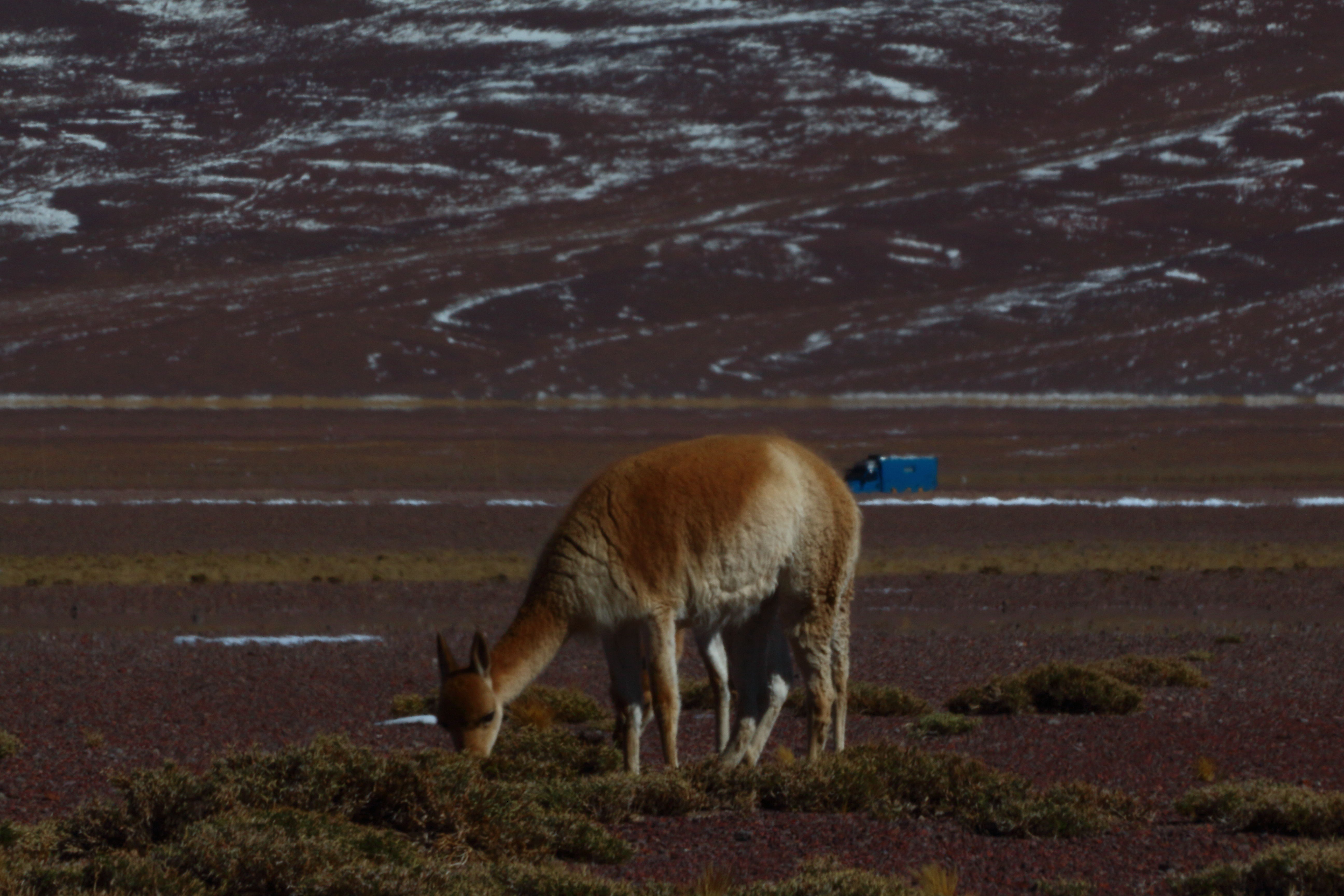 Remember we mentioned above that this is advertised as a ‘year-round’ border crossing…? Well the person who announced this should now be finding an extinguisher for their proverbial ‘pants on fire’! At the border-post a friendly police chap explains that due to snow some 40 km further towards the Pass, the border is not open today. They are apparently working hard to clear the snow and the Pass may open tomorrow. It is already late Thursday afternoon, so parking-up for the night on the lakeshore with stunning views of the surrounding mountains would not be any great hardship. Next morning we are told that it will not open until Saturday or Sunday, but there is some amazing countryside to explore with glorious sunshine and clear blue skies, so we are happy to hang around and explore the area for a couple of days. At around 13,000ft the thin air makes it a challenge for us to undertake any steep walks in the mountains, but we visited the nearby Nevada Tres Cruces National Park and found some gentle walks across the flat plains. We loved sitting in the sunshine on the high Andes plains, watching a small herd of vicuñas (the llama’s smaller and cuter relative) which wandered up to about 10 metres from us.