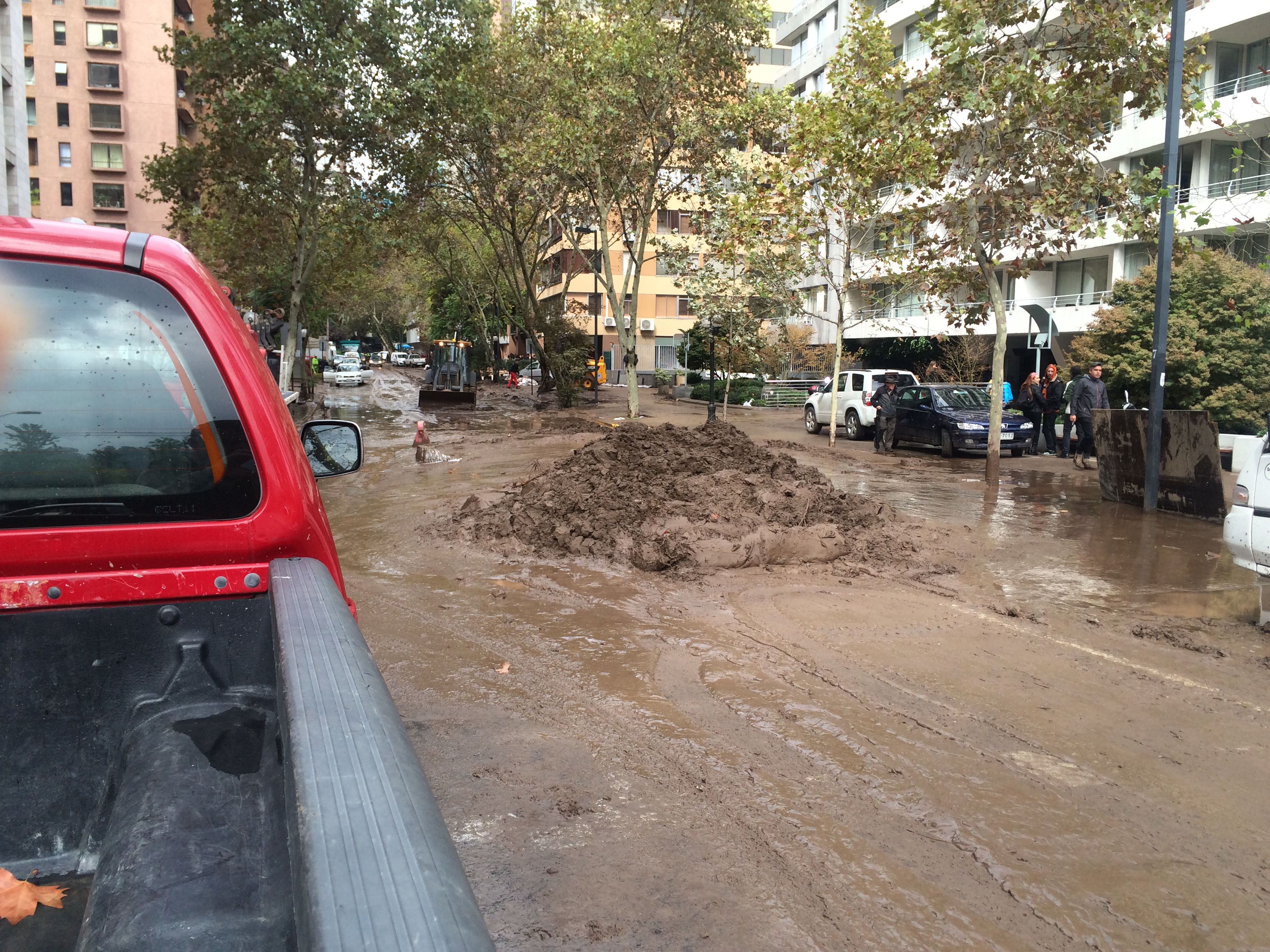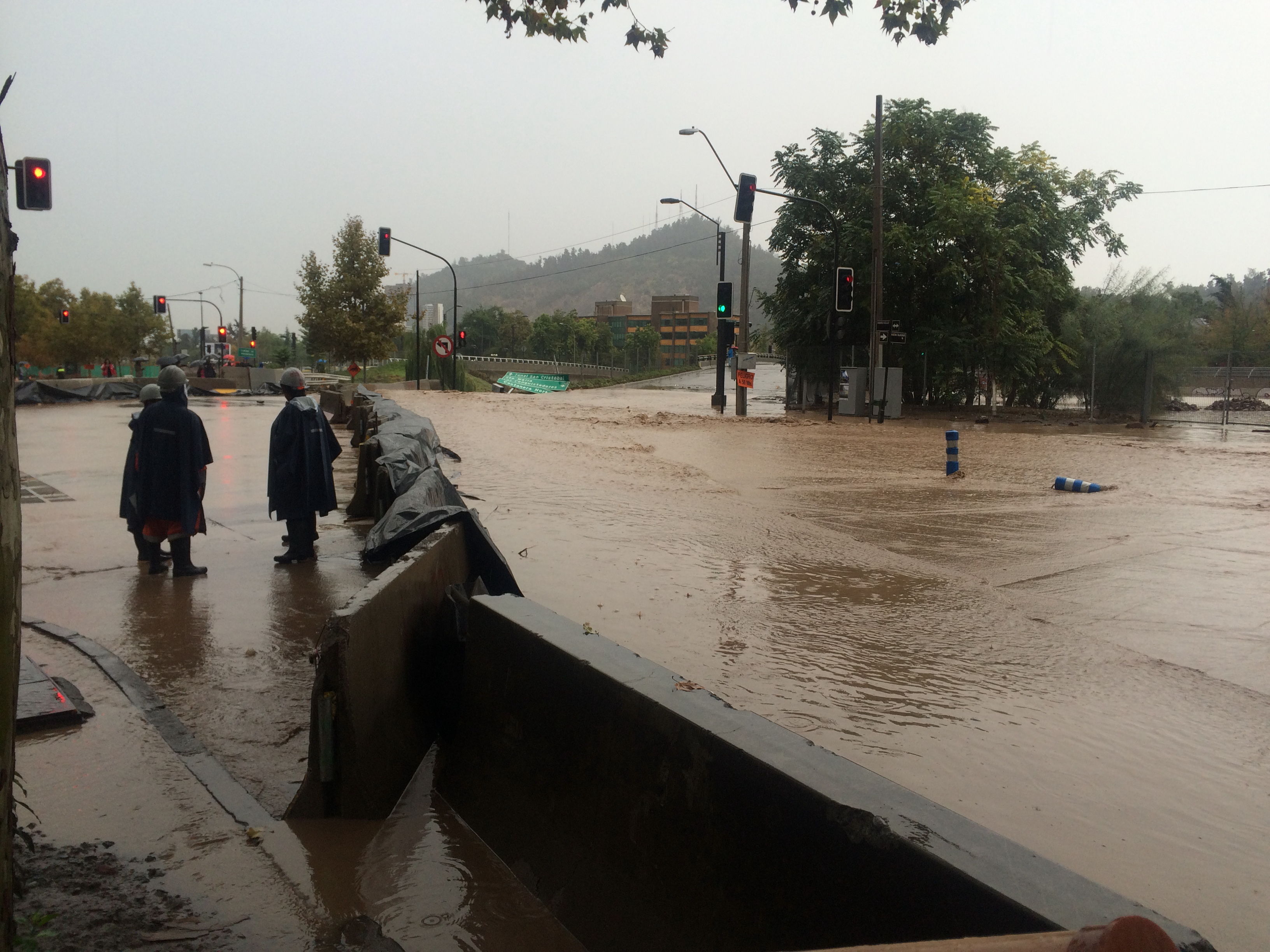 Anyway, during all this palaver we were parked-up in Cuthbert safe and sound, in a quiet park just 200-300 metres up the road from the scene. We were slightly above the flood-level and grateful for our own on-board fresh water supply. Although Cuthbert’s solar panels struggled slightly with the overcast conditions, we managed to keep everything running off our batteries, so we were more comfortable than many of the residents of central Santiago. We could keep tabs on the situation with local radio news and social media, but out of curiosity, we donned our wellies and gortex to inspect the mayhem for ourselves and to watch the Chilean TV reporters out on the streets doing live broadcasts.