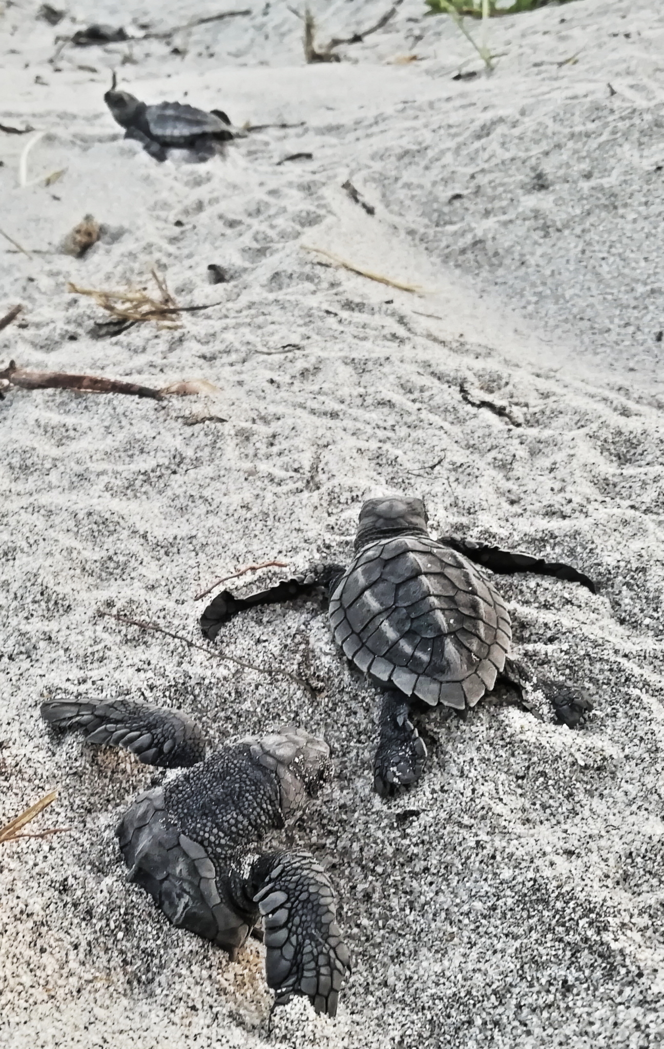 Taking a closer look, we were shocked to see how many of the ‘little black dots’ were clearly ex-turtles. Thousands of scattered tiny hatchlings lying dead – it was heart-wrenching. But thousands more of them were survivors, scrambling between their lifeless siblings. The survivors had a long schlepp to reach the sea. Some little chaps were racing along energetically to the lapping waves, but others looked utterly exhausted, struggling to put one flipper in front of the other. It’s a brutal survival-of-the-fittest out there… natural selection we guess. Local ladies were out collecting the survivors into buckets and depositing them into the sea, so we helped collect any that we could find that still had life and gave them a lift to the water.