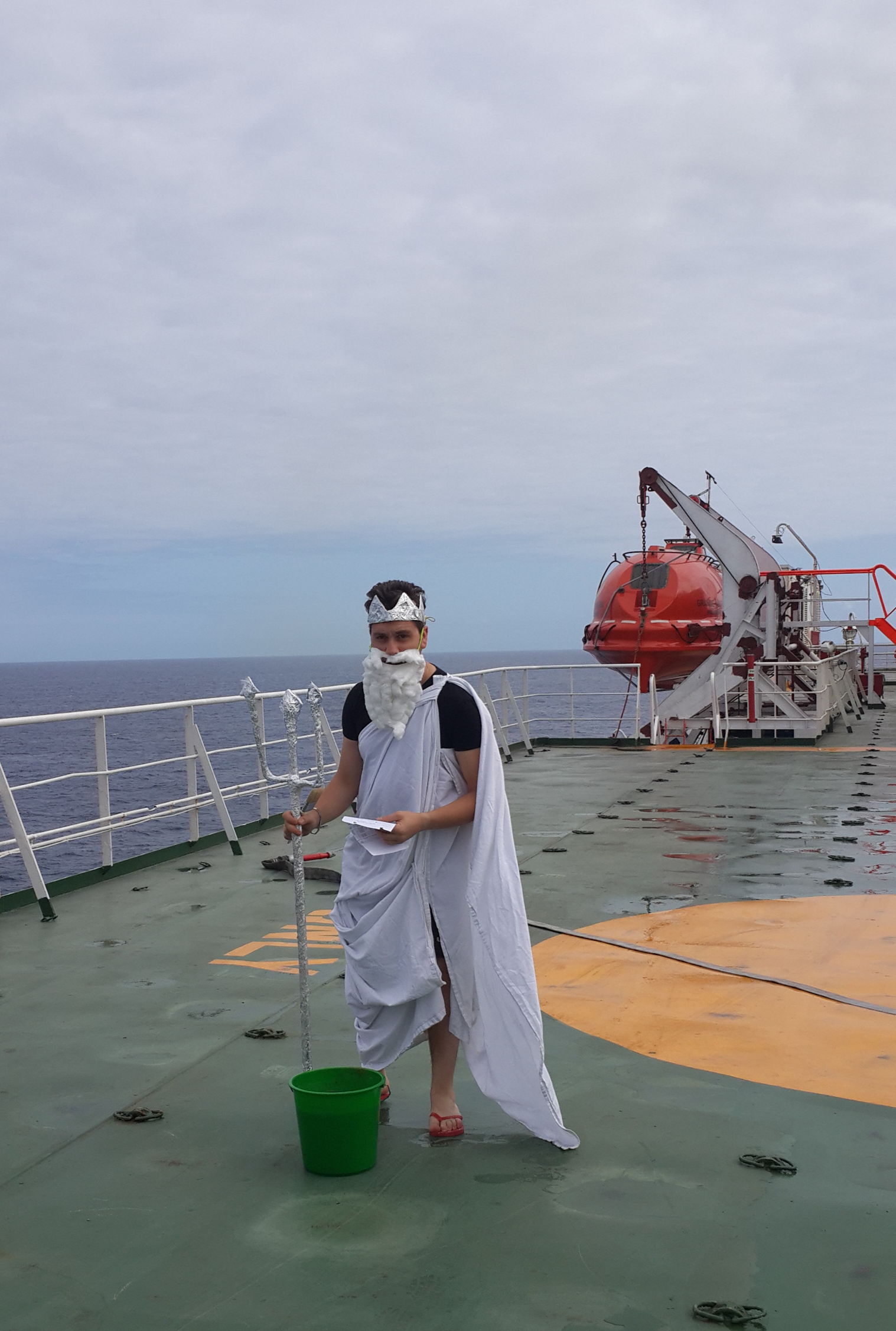 Monday (Day 20) around 09:30 hrs, we are all summoned to join the Captain up on the Bridge. We shipmates gather in the corridor amongst a buzz of curiosity and speculation as to what this could be about. The cocktails are not due for another half an hour! As we head up-stairs, Cadet Officer Angelo arrives in a t-shirt and beach shorts… hmmm! Captain ‘Super Mario’ is there (in his normal uniform) to greet us, together with one of the other officers dressed in a rather odd toga-style gown, with a cotton-wool beard, a tin-foil crown and a home-made trident in hand. We are introduced to Neptune!