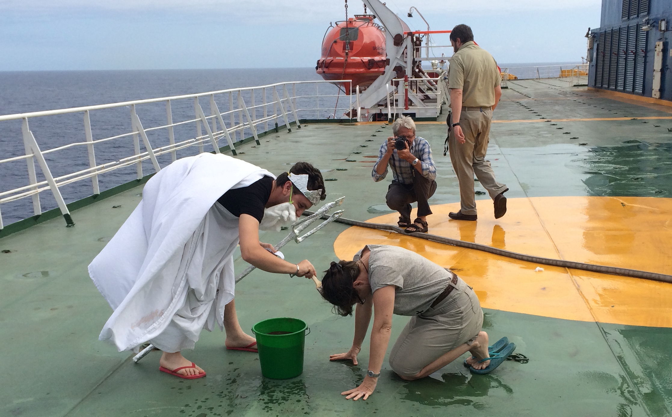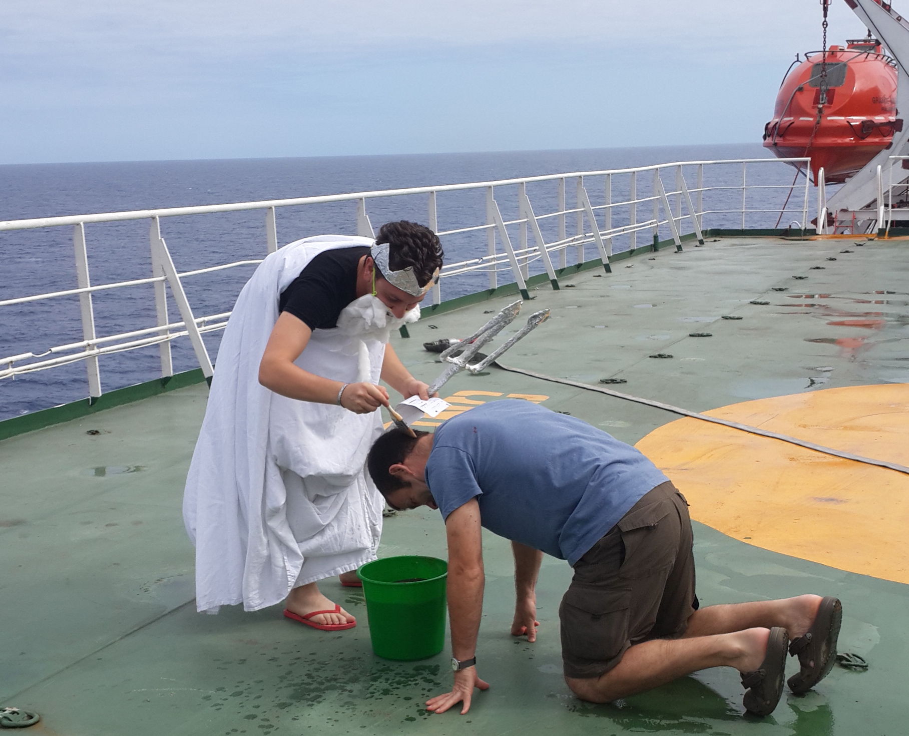 After all the passenger shipmates have undergone the ritual, it is the turn of the cadet officer and our cabin-boy, Salvi. It is their first crossing of the equator, so they receive not only the daubing of chocolate-water over their heads with a paint-brush, but the remaining contents of the bucket thrown over them and a thorough dousing from 3rd Mate Giuseppe with the fire-hose. Captain ‘Super Mario’ naturally stands well back and observes with patent delight, taking photos of the proceedings. It’s a light-hearted way to celebrate the equator crossing, but we have yet to establish the connection between the ritual and the chocolate-water. Most peculiar!