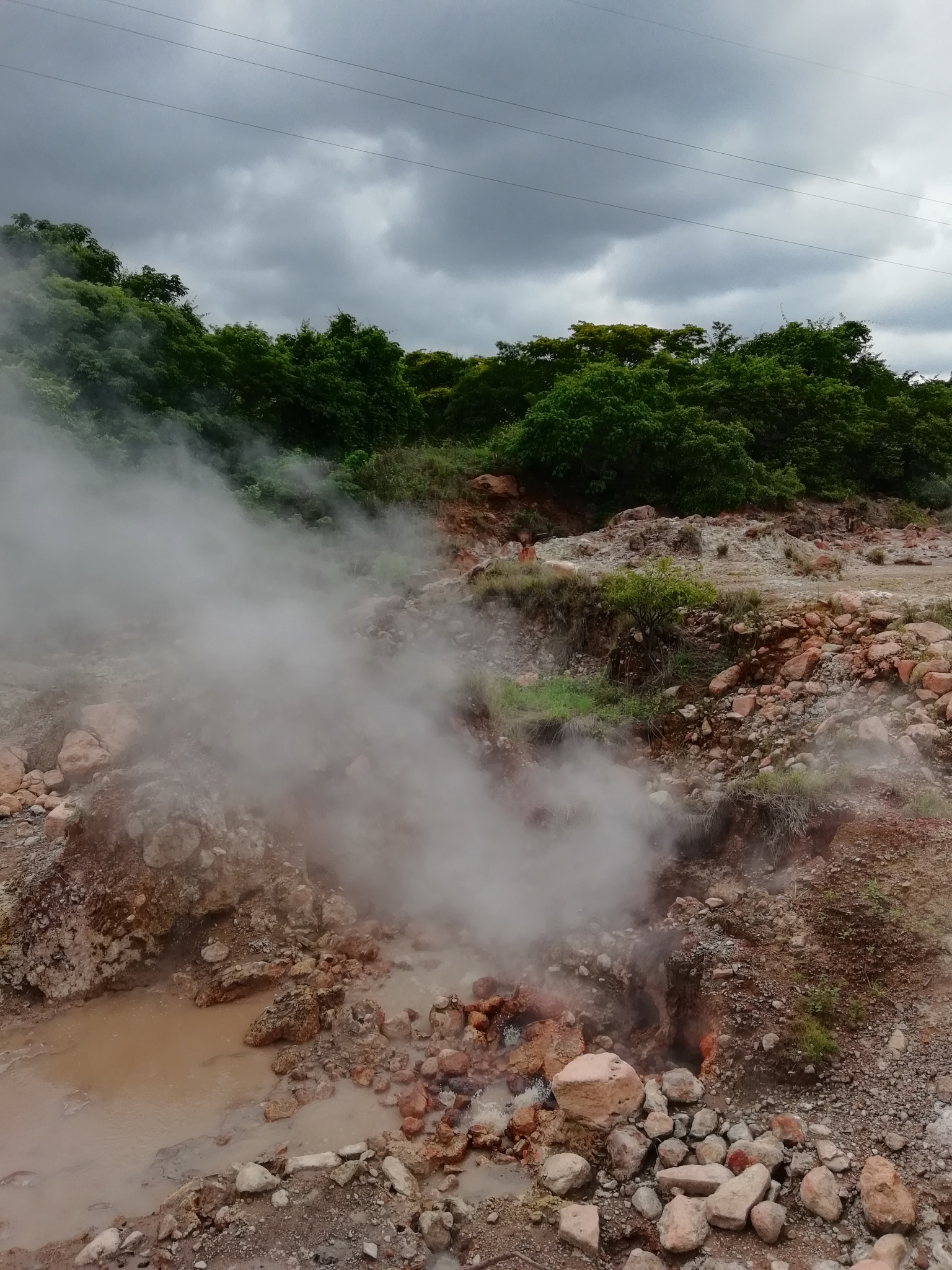 Along the route, we reckon there must be a lot going on in subterranean El Salvador. Not only did we see venting volcanos and emerald green crater-lakes, but also thermal springs of bubbling mud and steam-vents gushing out of the ground. There is also a substantial river flowing with hot water over a pretty waterfall. This could be an attractive place to bathe, but it really wasn’t crystal-clear water. As with many developing countries, El Salvador sadly hasn’t yet quite got the hang of the anti-pollution measures employed in some other parts of the world.