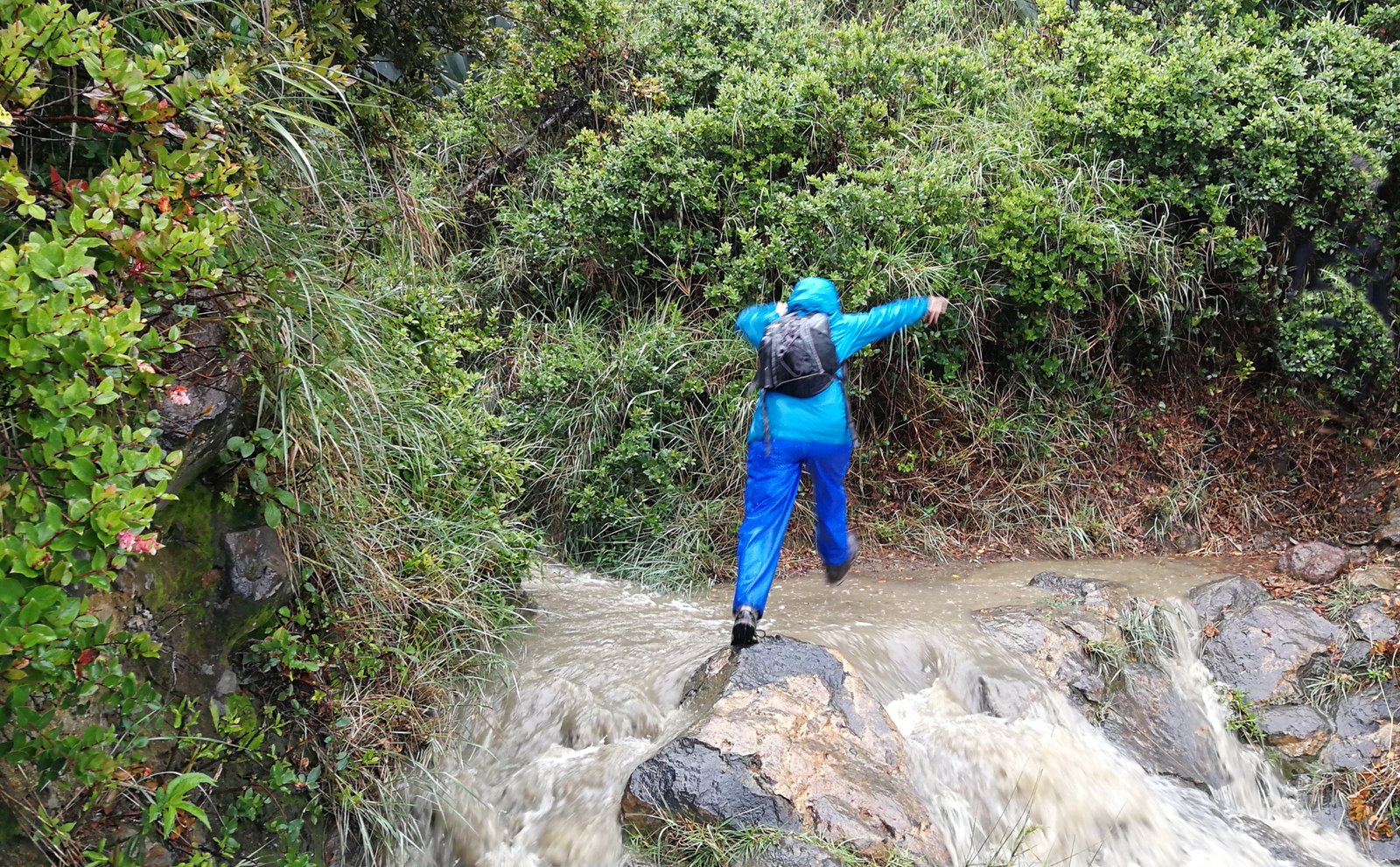 The surprising thing was how quickly the paths between the boulders turned into torrential and very fast flowing streams. It became a risky exercise of river-running down a steep, rocky slip-face. At times, the rain fell so heavily across our faces that we could hardly see the ground (or water!) below us; all we could do was follow the colourful blur of the person’s jacket ahead. Not surprisingly, our descent was considerably quicker than the climb.