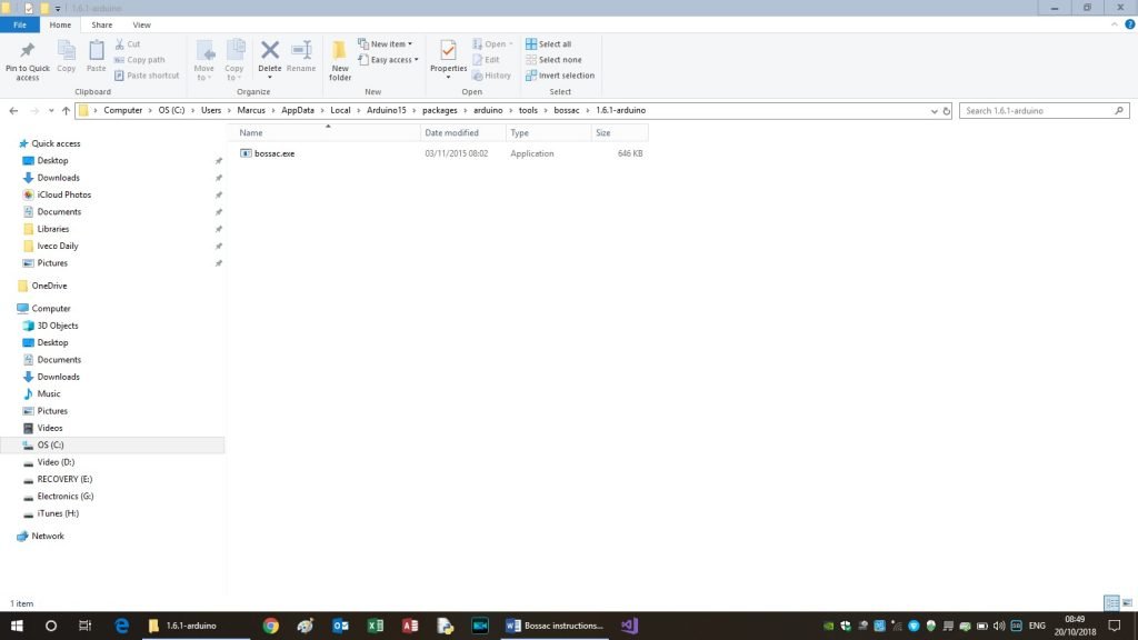 Next, find the “bossac.exe” program. It will be in your system somewhere as it is part of the Arduino IDE (in Windows Explorer you may need to select ‘view’ then ‘options’ then ‘view’ again and in ‘advanced options’ select ‘show hidden files, folders, and drives’ to be able to see it). On my computer, it is located here: