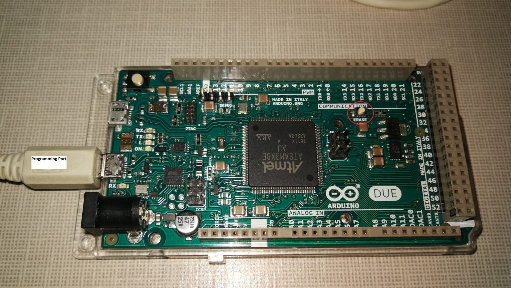 To load the new version AFAM software, remove the Arduino Due from the AFAM main circuit board, so you can access the erase button. There will be several screws holding the Arduino onto the bottom of the main board; once these are undone you can carefully withdraw the Arduino from the main board pins. Place the Arduino on a non-conductive surface and connect it to the computer with a USB cable plugged into the programming port, see photo below.