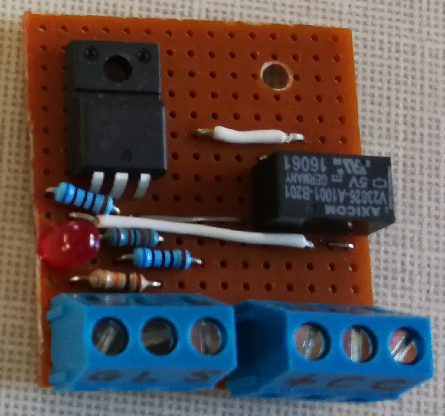 Below is the circuit diagram and photo of the interface between the BMS and the second split-charge relay. This interface monitors both the load and charge signal from the BMS. If either of the signals become floating, the LED illuminates, the FET is turned off and so the second split charge relay is also turned off. Note that the FET controls the ground wire of the second split charge relay. The manual switches I have to control this relay, supply the positive feed to it.